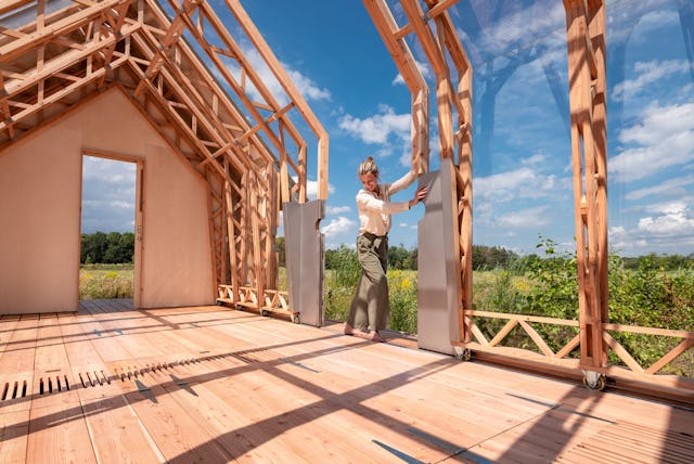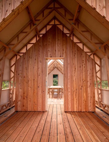 Het idee van Cabin ANNA is ontstaan vanuit een verlangen om samen mét de natuurlijke elementen te leven in plaats van volledige afscherming hiervan. “Eigenlijk gaat het vooral om het buiten zijn. Het creëren van de verbinding tussen huis, mens en natuur.” Het huis heeft twee verschillende ‘hulzen’ als buitenmuren, steunend op rails. De binnenmuur bestaat uit een raamwerk van hout en glas en is gescheiden van de houten buitenmuur met dak. Door de hulzen te verschuiven, zijn verschillende opstellingen mogelijk. “Zoals je je kleding aanpast aan het weer, je stemming of de gelegenheid.”, vervolgt Schols.