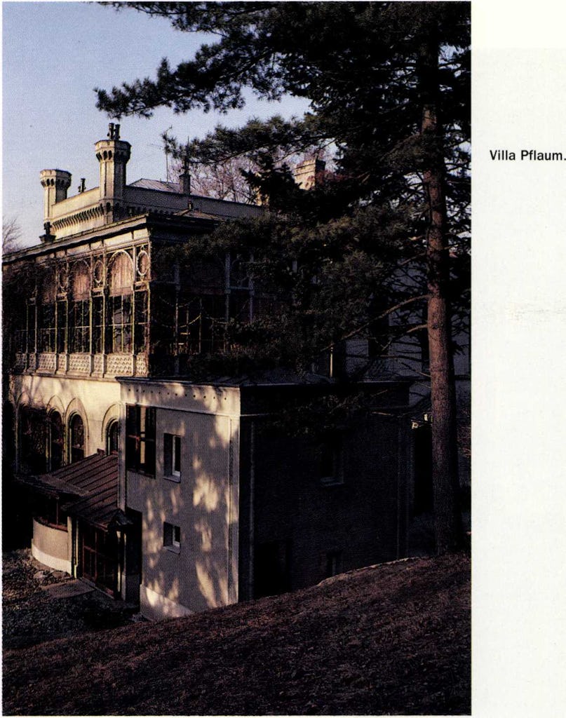 Het ontwerp voor de ver- en aanbouw van de villa Pflaum in Altenberg ( 1977- 1979) bestaat uit drie onderdelen die elk op zich een eigen standpunt innemen ten opzichte van de uit 1848 daterende ’oudbouw’. Allereerst is er een getrouwe restauratie van een deel van de gevel; hierachter bevindt zich een slechts gedeeltelijk verbouwde ruimte. De hoek van het bestaande gebouw, die van zijn stucwerk is ontdaan zodat de ruwe steen zichtbaar wordt, is het punt waaromheen de kleine veranda scharniert: een bevroren beweging die herhaald wordt door de uitwaaierende vorm van de plafondbalken. Een klein kubisch gebouw dat binnen zijn eigen schaal de proporties van het voorste gedeelte van de villa herhaalt is op zijn beurt met de veranda verklonken en overlapt middels de plattegrond de ruimte van de veranda, zoals de buitenmuur van de oude villa binnenmuur van de veranda is geworden. Zo ontstaat een gelijktijdigheid van gemonteerde typologisch en morfologisch verschillende elementen die juist hun onderlinge verschil tot inzet van een nieuwe eenheid maken.