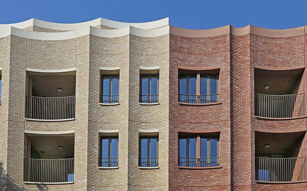 De keuze van de juiste gevelstenen was erg belangrijk en moest overeenstemmen met de visie van dit ontwerp, zegt Rohilla. ‘Voor ons was het essentieel om de juiste tinten rood, geel en grijs te halen uit de gebouwen in de buurt. De sorteringen Cayenne, Toscane en Lima van Vandersanden sluiten hier perfect op aan. Ze vormen ook een harmonieus geheel met de kleurnuances van de betonnen dorpels en boordstenen, net als met de kleuren van de ramen en balkonrelingen.’
