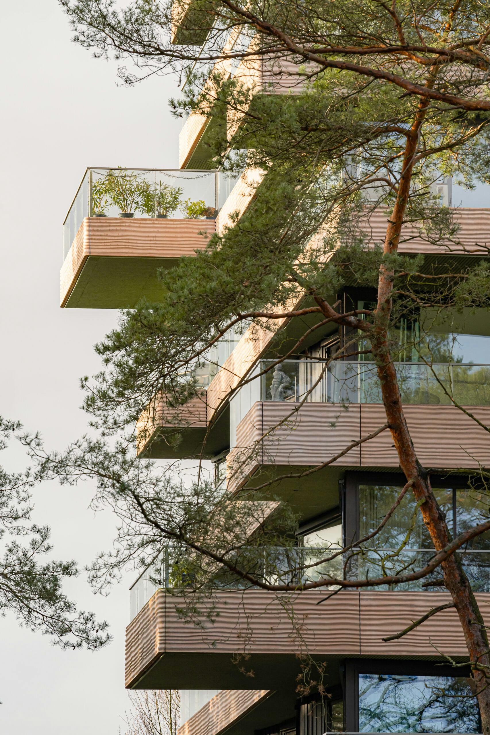 De appartementen zijn uitgerust met royale buitenruimtes, waarbij de gevels strategisch zijn geknikt om de grens tussen binnen en buiten te vervagen. De borstweringen zijn ontworpen met een patroon van zandribbels, terwijl de buitenplafonds zijn afgewerkt met ribbelvormige houtwolcement panelen. De gevelbekleding is uitgevoerd in Fraké-hout, wat het thema ‘stam’ weerspiegelt. Het landschapsontwerp rondom het gebouw bevordert de biodiversiteit, met lokale vegetatiesoorten op de parkeergarage en diverse oplossingen om deze in het landschap te integreren.