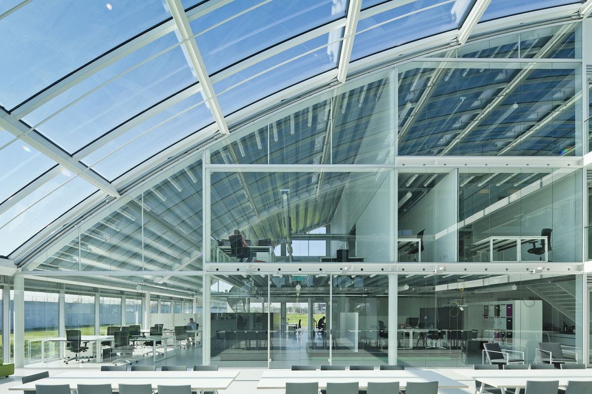 De vloervelden van het gebouw hebben een u-vormige plattegrond en lopen trapsgewijs terug onder een gekromd dak. In het hart van het gebouw is een transparant overkapt atrium gesitueerd, uitlopend in een buitenterras. Dit bevat gemeenschappelijke voorzieningen als informele overlegplekken en een klein restaurant en draagt bij aan de mogelijkheid tot ontmoeten en synergie in het gebouw.