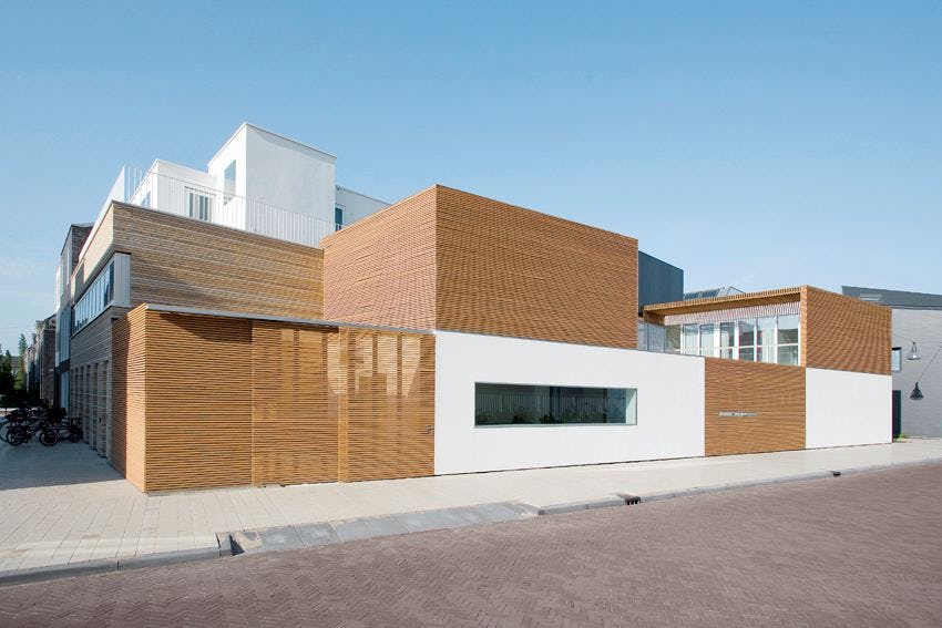 Het resultaat is een introvert gebouw waar alle grote glasvakken achter houten schermen schuil gaan en de buitenkant voornamelijk wordt gekarakteriseerd door twee lange, horizontale glasstroken van zes en acht meter lengte. Beide laten het noorderlicht toe tot diep in de woning.