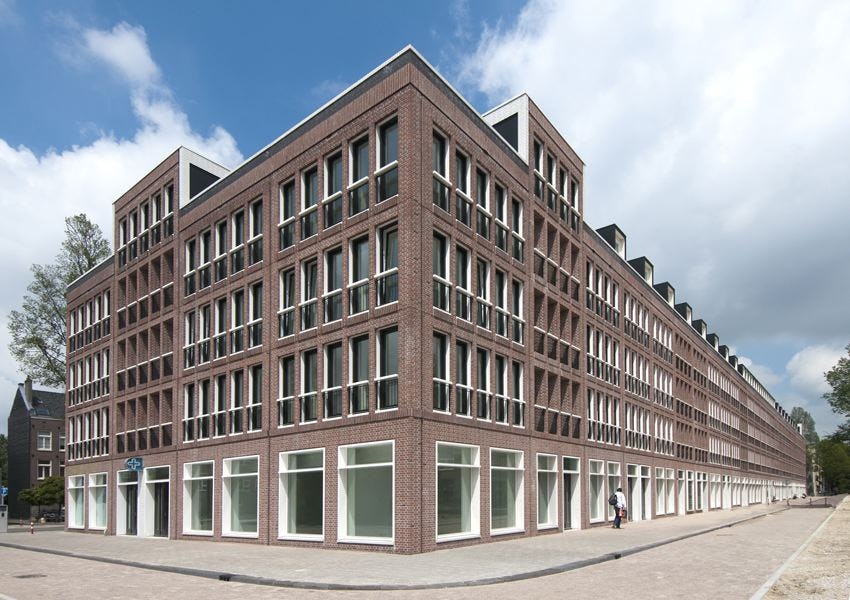 In eerste instantie is het gebouw ontworpen voor een traditionele bouwwijze, zodat het stedenbouwkundig vereiste metselwerk met dezelfde slankheid en details uitgevoerd zou kunnen worden als de naburige 19e eeuwse panden. Het blok ligt echter aan een doorgangsroute met een zeer beperkt aantal parkeerplaatsen en monumentale bomen die zeer dicht op de gevel staan, zodat er geen mogelijkheid was om steigers te bouwen.