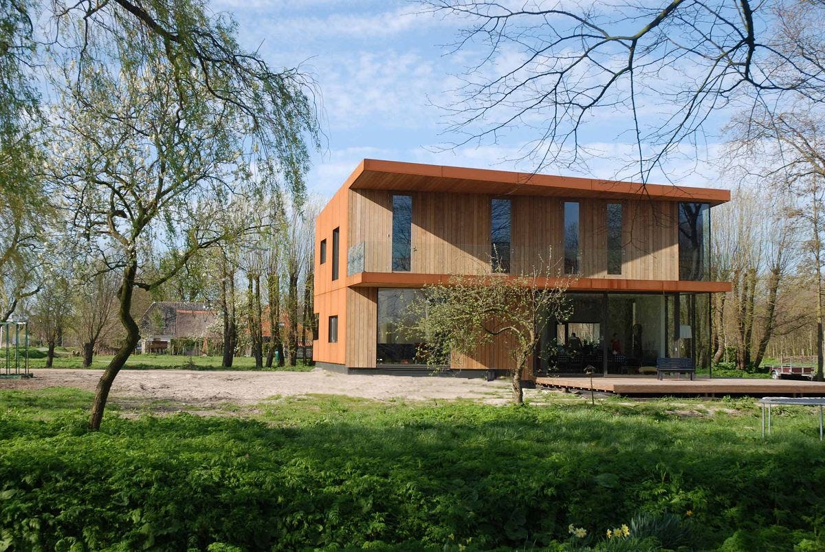 De gevel is door Change.nl voorzien van een Corten stalen beplating die het volume omhult als een dunne tweede huid. De waterdichte laag ligt daarachter. De meer beschutte vlakken van de gevels en de terrassen zijn uitgevoerd in een duurzame houtsoort (Nobelwood), net als de kozijnen, ramen, deuren, gevel-, vloer-, en plafondelen.