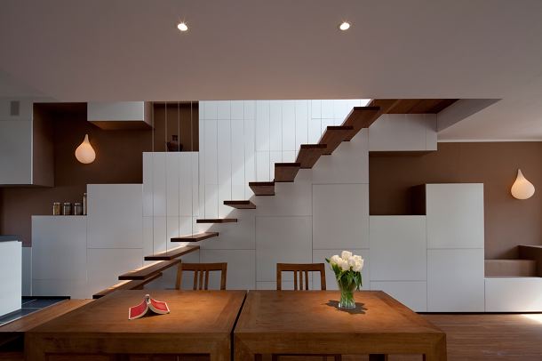 Door op een slimme manier gebruik te maken van de verschillende vloerniveaus, ontstaat een ruimtelijk spel van functies die zijn geschakeld om een sculpturale 'boekentrap'. De luie trap die uitkraagt uit de boekenkast functioneert als een meubel in de ruimte en laat het zonlicht tot ver in de woning toe. De trap verbindt de woonverdieping met de nieuwe opbouw, waardoor de bestaande keuken en het nieuwe dakterras visueel zijn verbonden.