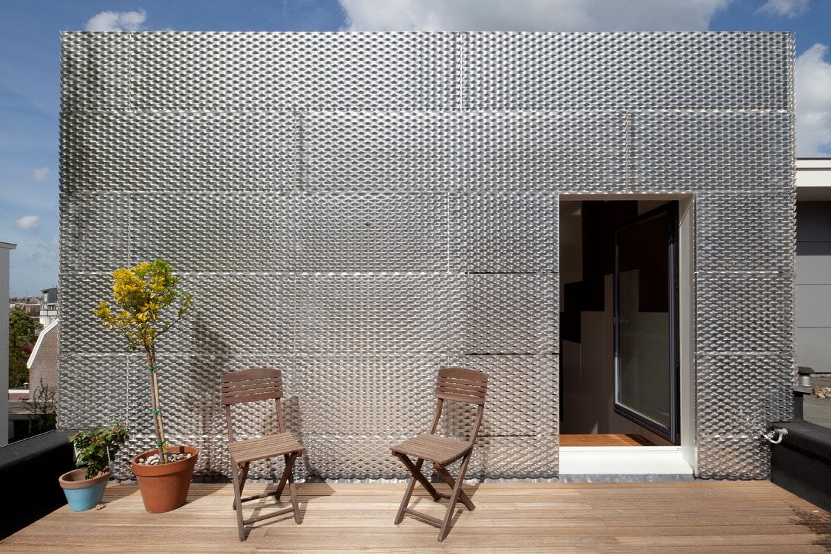 De strekaluminium panelen van de extra bouwlaag zijn inwaterend gemonteerd en laten zonlicht door, terwijl de privacy van de bewoners gewaarborgd blijft. De kozijnen die deels achter de metalen voile verdwijnen accentueren de gelaagdheid van de gevel.