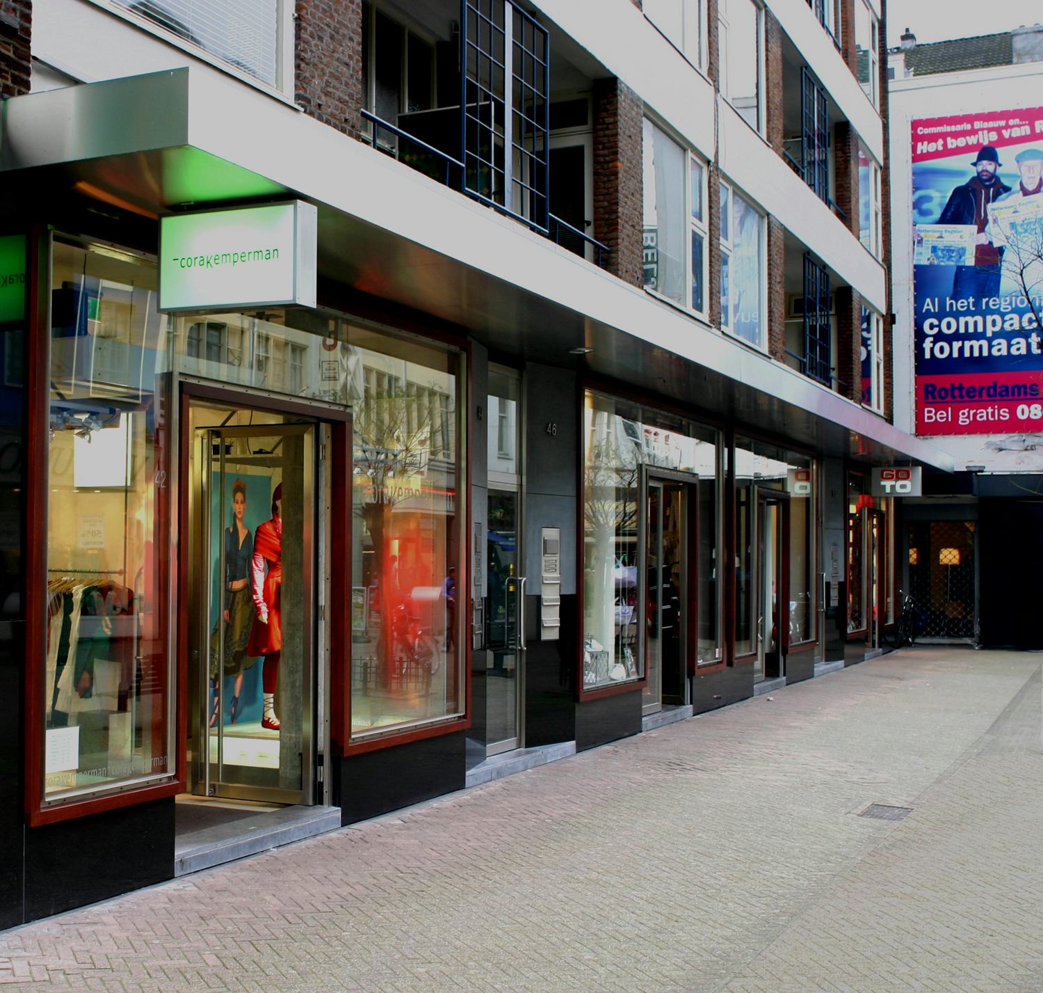 Oude Binnenweg 42-50: de winkelruimte is geschikt gemaakt voor 3 zeer verschillende winkelfuncties. Uit architectonisch oogpunt is er eenheid in de gevel gebracht die aansluit bij de ritmiek van de bovenbouw. Daarnaast zijn de winkeleenheden en woningentrees individueel herkenbaar gebleven.