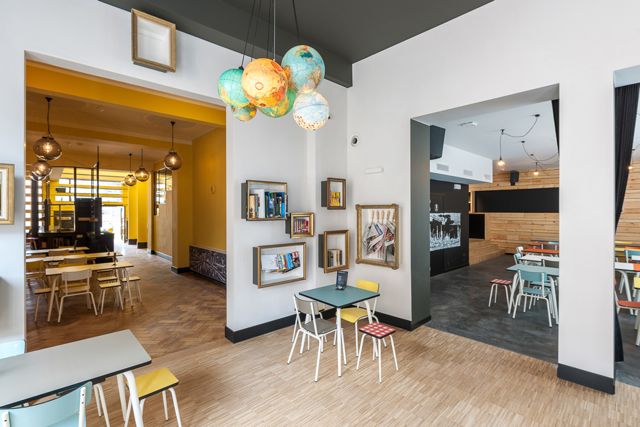Om de ontmoeting tussen locale bevolking en reizigers te faciliteren, zijn de lobby, de bar, de ontbijtruimte en het terras naadloos met elkaar verbonden. Het barmeubel werd bekleed met honderden houten zetletters uit de collective van drukker Luc Strobbe (Izegem). De kleurijke wereldbollen verlichten onze bar met een speelse knipoog.