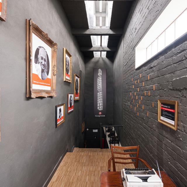De sobere, betonnen structuur van de bovenste lichttoren inspireerde ons vanaf het begin. We zochten een gepaste invulling voor deze onbepaalde ruimte met het bijna sacrale zenithale licht. Hoe konden we de geschiedenis van het gebouw beter eren dan deze ruimte ter beschikking te stellen van al wie gebeten is door schrijven... We noemen deze ruimte onze "blogkamer", gesitueerd in de verlichte toren van de voorgevel. Ze wordt gratis ter beschikking gesteld voor reizigers en Gentenaars om hun verhalen neer te pennen.