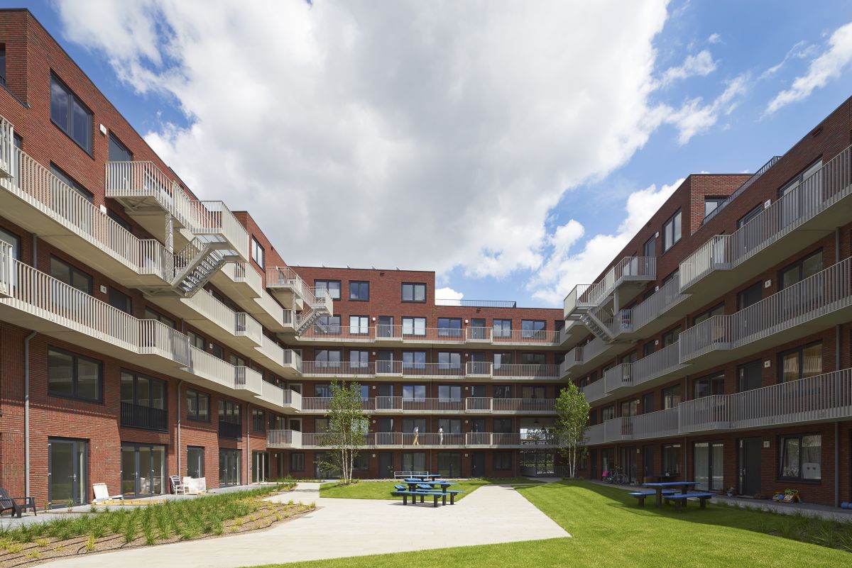 Rijkelijk gedetailleerd metselwerk en bijzondere entree hekwerken zorgen ervoor dat het nieuwe blok goed aansluit op de bestaande woonblokken van de Grunobuurt.