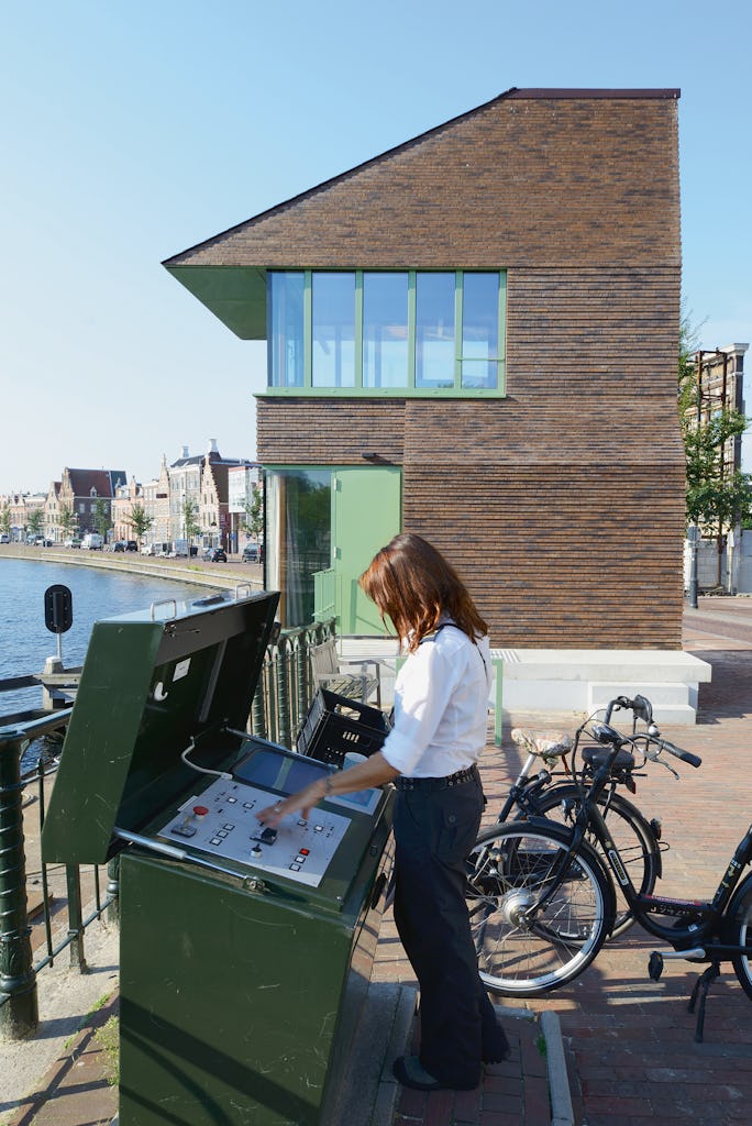 Behalve dat het huisje verkeersstromen begeleidt, lopen ook stromen door het huisje heen. Het hemelwater wordt afgevoerd door een groene regenpijp die niet uitmondt in het riool maar anderhalve meter is doorgetrokken en afvoert op de rivier. Minstens zo origineel is de inpassing van de pv-leien op het dak. Tot deze oplossing besloot de architect, toen noch panelen noch folie tot bevredigende oplossingen bleken te leiden. Het circulaire denken dat de architect hanteerde, is niet alleen herkenbaar in de keuze van de baksteen of in de toepassing van vlaswol in plaats van steenwol in de spouwen. In Haarlem bedienen de brugwachters de bruggen en hebben ze bovendien een toeristische functie. Om deze reden zijn ze behouden en worden de bruggen niet centraal bediend. Toch valt dit laatste voor de toekomst niet uit te sluiten. Het Melkhuisje is daarom zo gemaakt dat er betrekkelijk gemakkelijk een vakantiewoning van valt te maken.