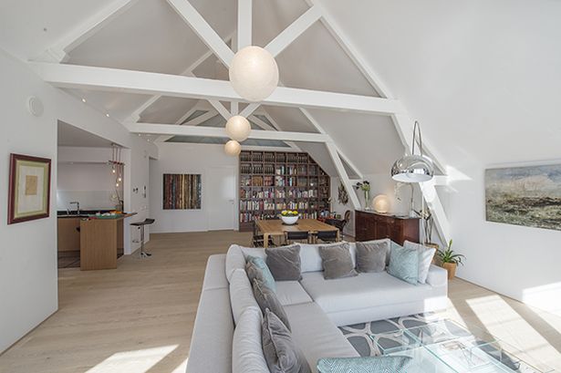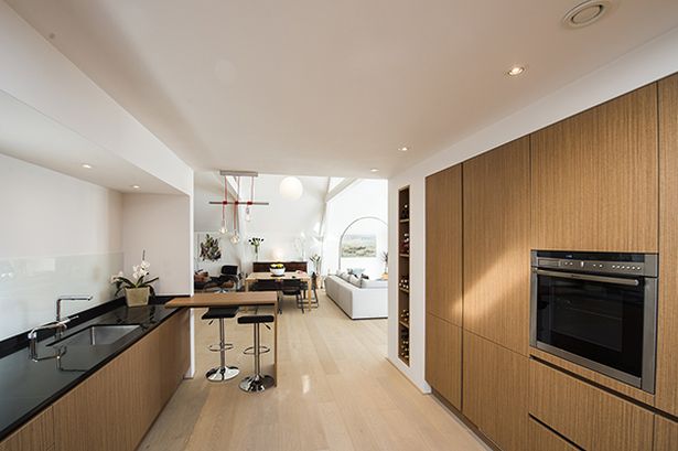 Aan de achterzijde is een grote ruimte aan de woonkamer toegevoegd die als ‘speelkamer’ dienst doet. Vanuit de woonkamer zijn openslaande deuren naar twee kleine balkons en de speelkamer geeft toegang tot een groot balkon. In de badkamers, de keuken, slaapkamer en de hal zijn alle kasten ontworpen door de architect, die ook verantwoordelijk is voor de inrichting, de meubels en de verlichting.
