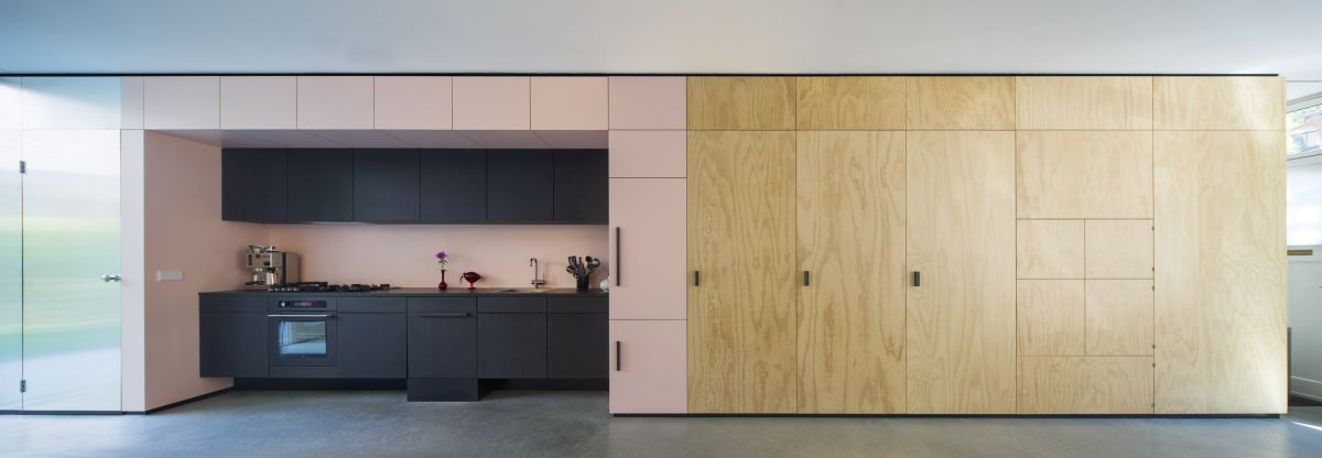 Het wandmeubel is ontworpen als uitgerekte barcode van drie contrasterende materialen die de leefruimte differentieert. Elk materiaal creëert een gebruikszone met een eigen identiteit, zonder de continuïteit van de ruimte aan te tasten: een warme houten bekleding van underlayment voor de living, een hygiënische HPL in roze voor de keuken/eetkamer en een weersbestendig aluminium beplating voor het terras.