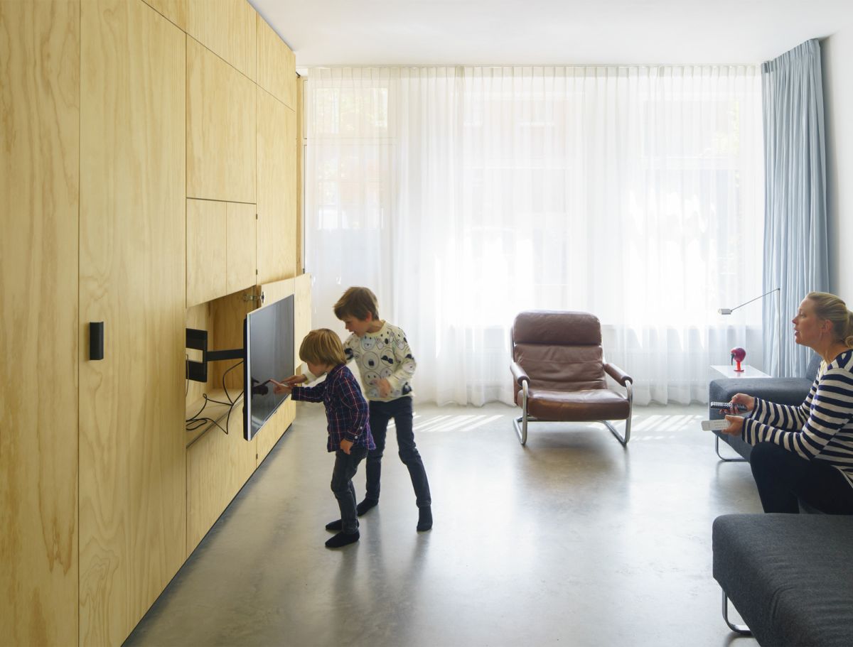 De relatie met de straat wordt versterkt door de afwezigheid van een entreehal; men komt het huis direct binnen in de open leefruimte. Hierdoor wordt de brede stoep met typische Amsterdamse geveltuinen bij het wonen betrokken. De relatie met de tuin wordt benadrukt door het doortrekken van de wandkast in de achtertuin. De buitenkast begeleidt een terras dat binnen en buiten naadloos verbindt en voorziet deze van privacy richting de buren.