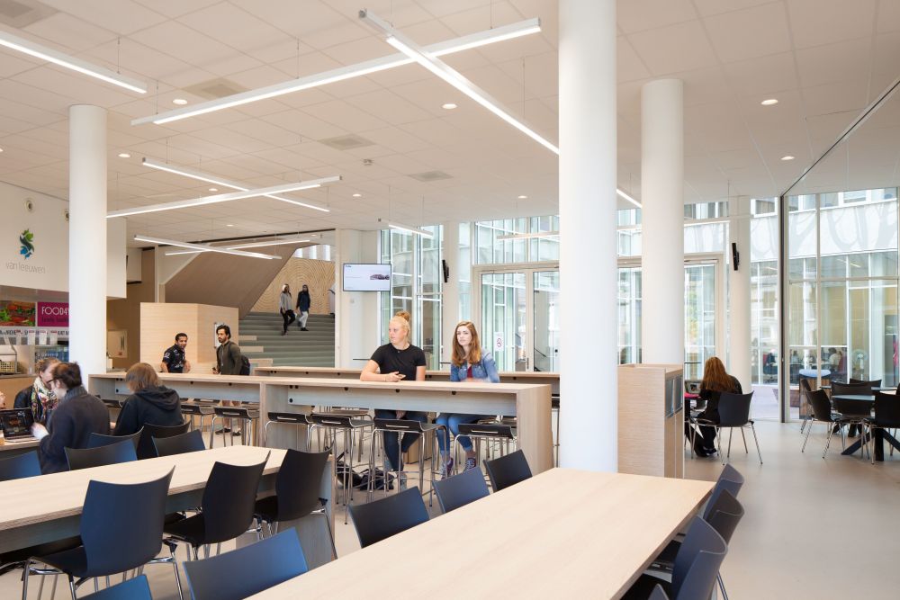 De plattegrond is helder georganiseerd rond een circulaire ontsluiting, met onderwijsruimtes aan twee zijden. Op de begane grond ligt een grote gemeenschappelijke kantine en verschillende praktijkruimtes, naar boven toe krijgen klaslokalen de overhand. De multifunctionele opzet biedt ruimte aan verschillende soorten individuele en collectieve werkplekken; voor informatievergaring, als gemeenschappelijke ontmoetingsplek en om te zien en gezien te worden. Via twee kleinere lichthoven en het centrale atrium valt veel daglicht binnen. De klinkers en houten zitmeubels geven het atrium een publiek karakter. Het krijgt hiermee de functie van een schoolplein dat zowel een verbinding als buffer vormt tussen de stad en de school.