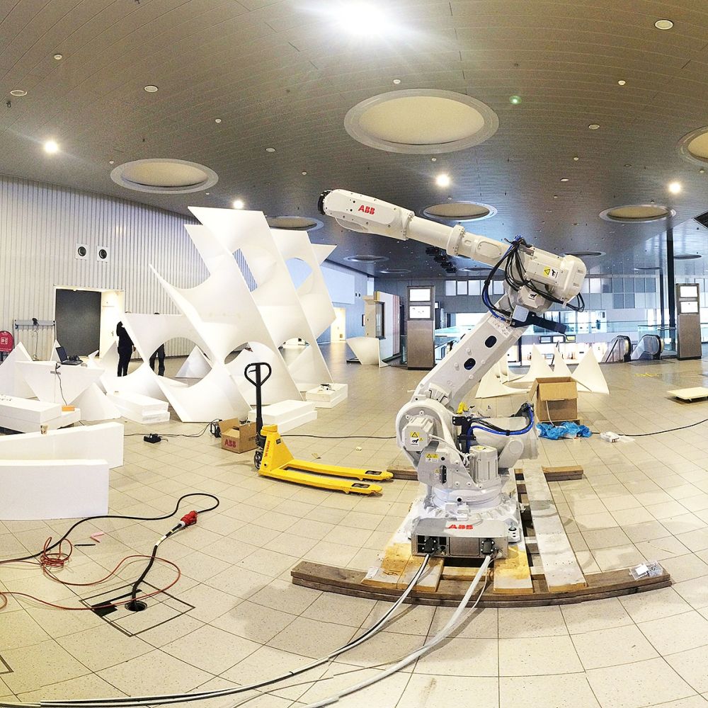 Het uiteindelijke resultaat was een constructie van 4 bij 4 bij 4 meter. De organisatie van Building Holland stelde een stuk beursvloer beschikbaar waarop het team van Studio RAP en UNStudio met de robotarm aan de slag kon.
