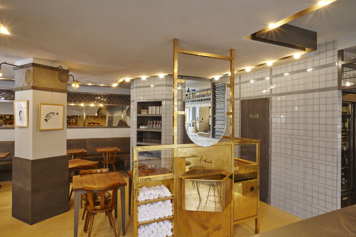 In het interieur zijn veel specifieke elementen ontworpen om de visbar een unieke identiteit te geven. Blikvanger is bijvoorbeeld de menukaart met hoekse spiegels, waardoor een vervreemdend beeld ontstaat. Een tafel voor grotere groepen loopt uit in een halfronde plaat met schubbenmotief.