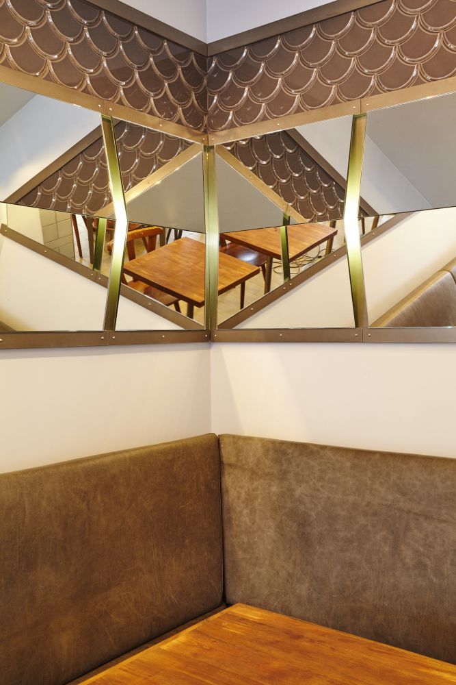 Het caféinterieur is door een goudkleurig element opgedeeld in een restaurant en een informeel zitdeel dat gekoppeld is aan de bar. De restaurant is afgewerkt met hout en leer, het informele deel met tegels en zink.