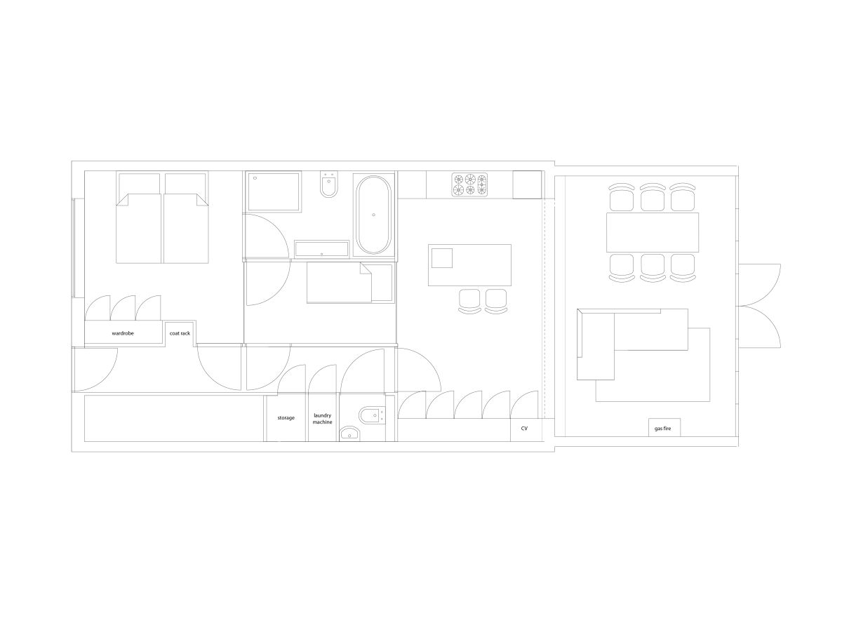 Het appartement heeft door het ingetogen materiaalgebruik een evenwichtig karakter gekregen. Alle kasten en opbergplekken zijn geïntegreerd in de wanden. De kastdeuren zijn vervaardigd van eikenhout met eenvoudige grepen. Het kookeiland van roestvast staal vormt hiermee een mooi contrast.