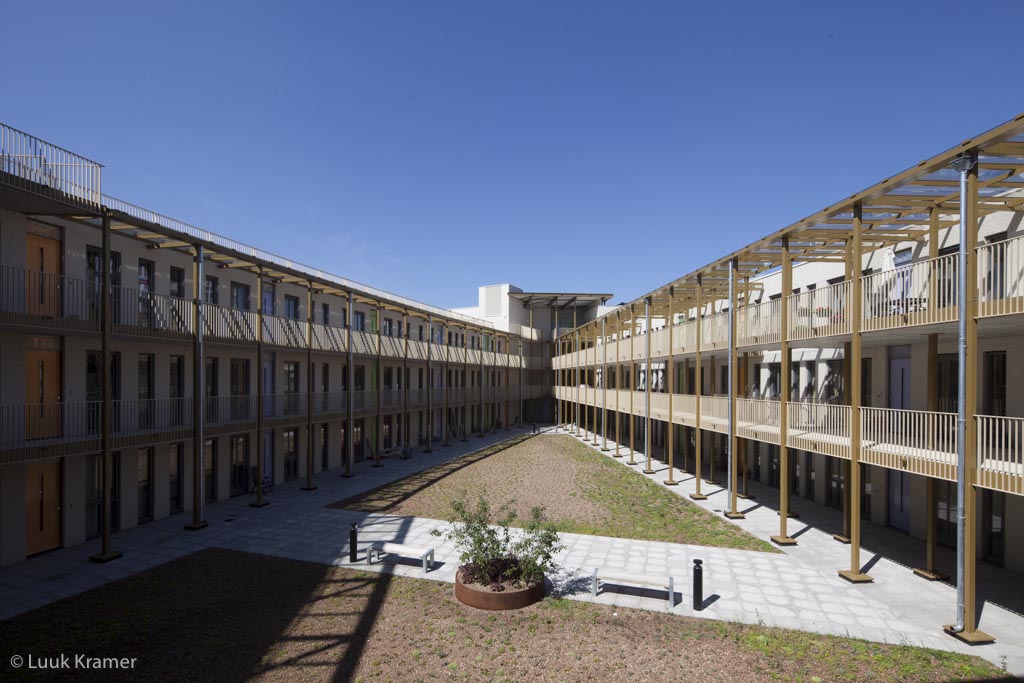 De gevarieerde gevels van beide gebouwen ontlenen hun referentie aan 19de eeuwse straatbeelden, zoals de Linnaeusstraat. Baksteen met sierpatronen en uitkragend metselwerk vormen een contrast met de open glazen winkelpuien en hun monumentale stalen overspanningen. Een passage tussen de blokken verbindt de wooncomplexen in architectuur. Aan het plein is de architectonische expressie van het gebouw bewust afwijkend; dit om het wooncentrum niet te verstoppen maar juist aan het plein een uitstraling te geven waar elke bewoner mee voor de dag kan komen en zich mee kan identificeren. Binnen de grote orde van de karakteristieke getordeerde zuilen wordt elke individuele kamer toch weer onderdeel van een groot geheel.