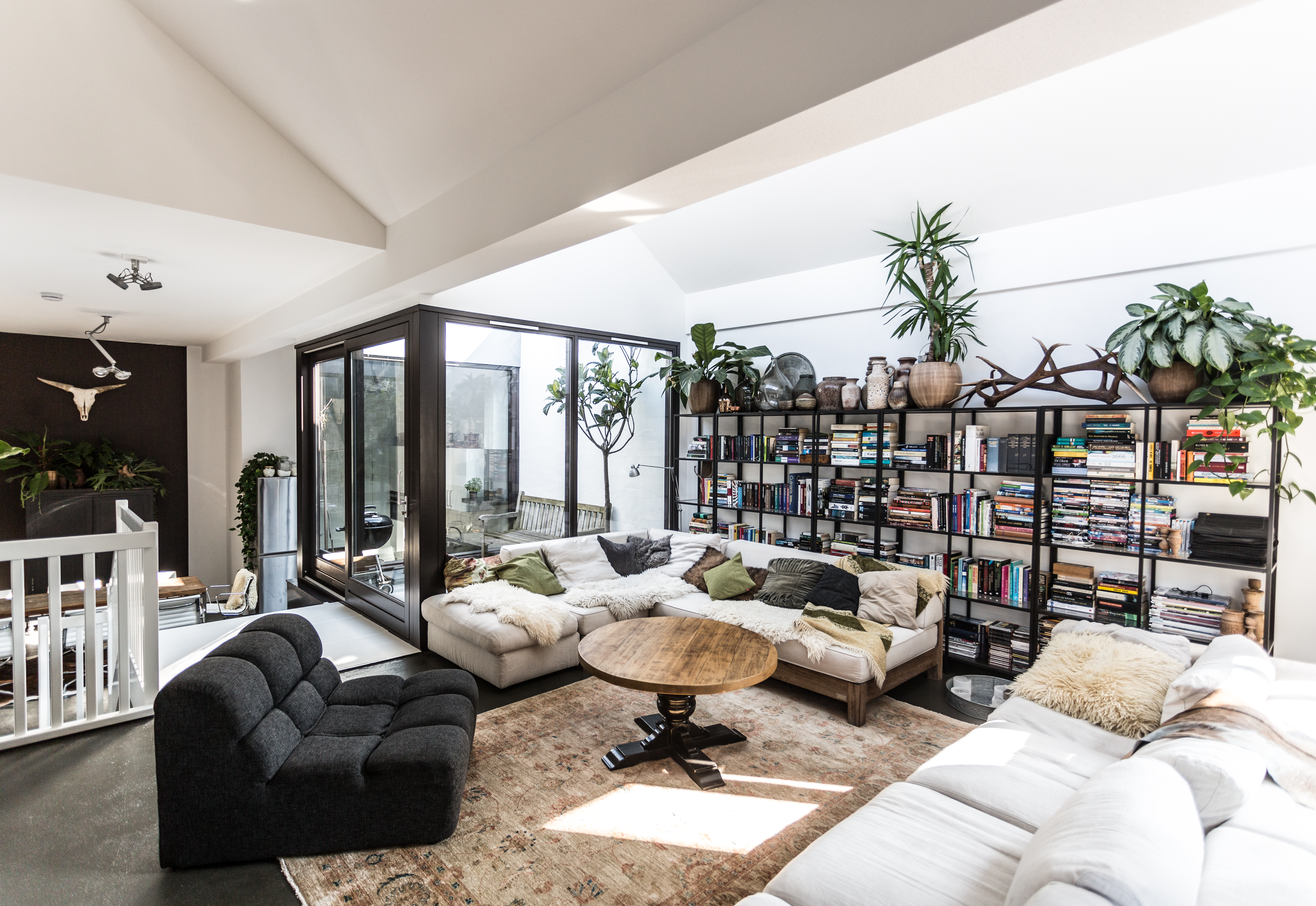 De vrije hoogte op de verdieping van de bestaande loods was onvoldoende voor de gewenste woonkwaliteit. Het nieuw geplaatste sheddak creëert wel de gewenste hoogte in de leefruimtes aan de oost- en zuidgevels. Bij de patiowoningen is er tevens gewerkt met een split level vloer waarin het vloerpeil van de helft van de eerste verdieping met bijna een is meter verlaagd waarmee ruimte is ontstaan voor de keuken en eetruimte. Naast de patio is een trapvide waardoor het licht van de sheds en de patio de hal van de begane grond bereikt. Rond deze hal liggen de slaapkamers, het sanitair en de overige ruimtes.
