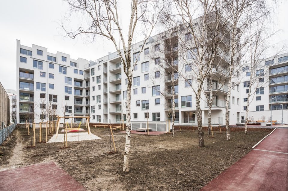 Het geknikte volume biedt plaats aan een diversiteit aan woningplattegronden, waaronder appartementen en maisonnettes van verschillende grootten. Ook kunnen twee kleine appartementen worden gecombineerd tot een grotere. Elke woning heeft een balkon aan de achterzijde, gericht op de gemeenschappelijke tuin met speelplaatsen.