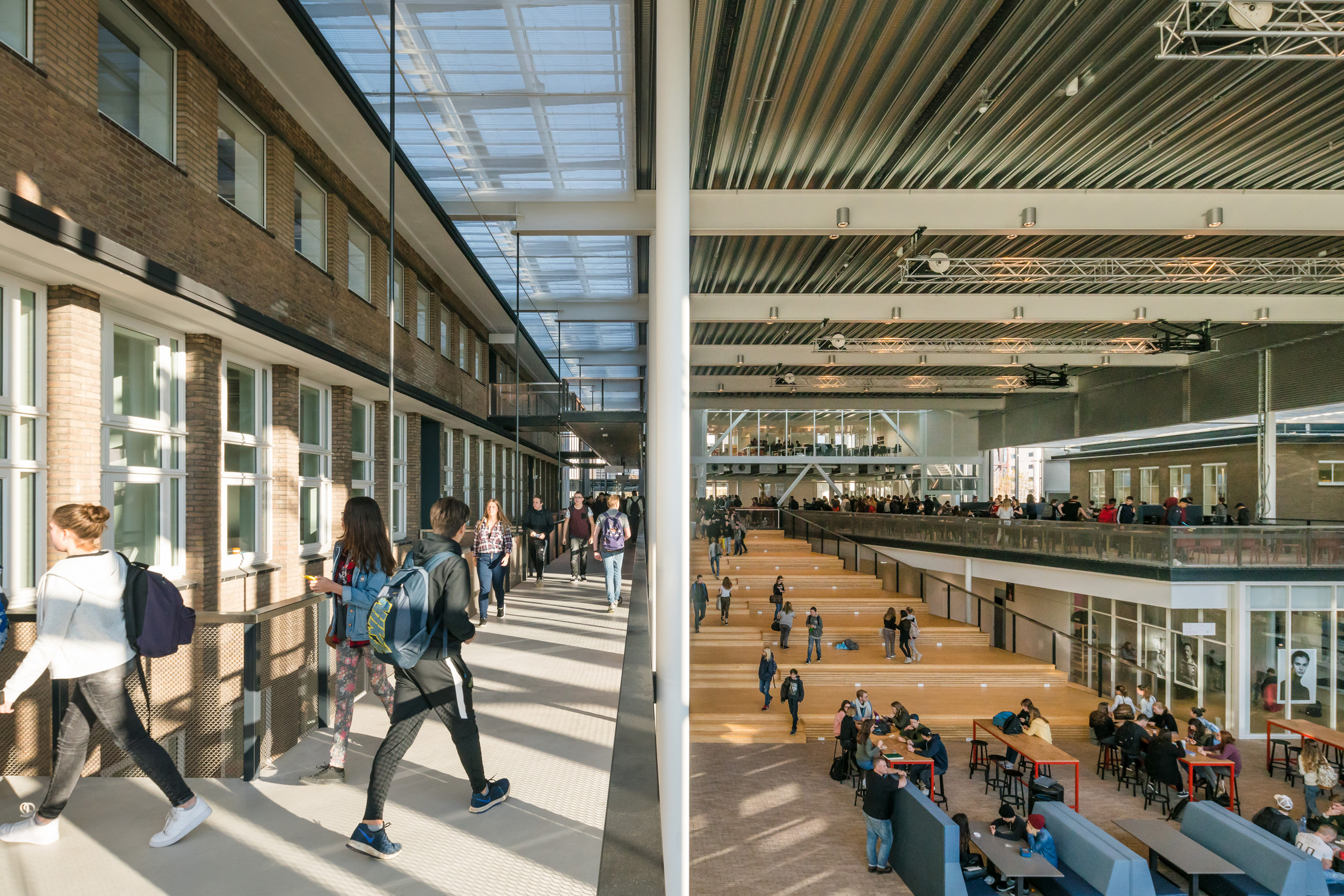 “Onder het schoolmotto ‘zien werken, doet werken’, maar ook voor de oriëntatie en een prikkelende, gedifferentieerde ruimtelijke beleving en veel daglichttoetreding is veel transparantie het complex in gebracht.” stelt cepezed. Met lichtstraten worden de bestaande gebouwen gescheiden van de nieuwbouw. Ze behouden zo hun eigen karakteristiek en waarde, maar vormen tevens een samenhangend geheel.