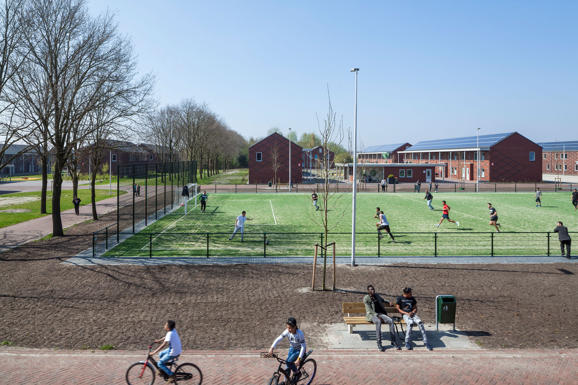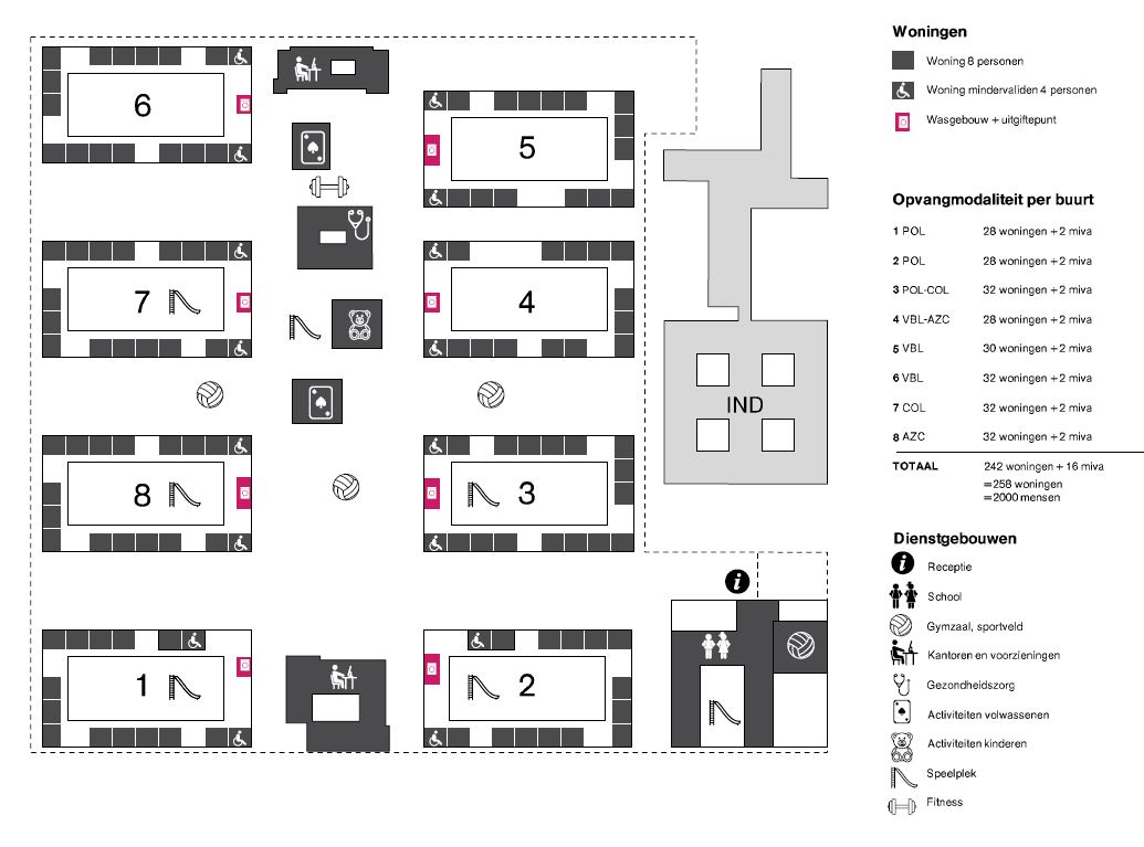 “Door een intelligente organisatie van het gebied, zorgvuldige uitwerking in ontwerp en efficiënte bouwmethodiek is het gelukt om binnen de sobere en doelmatige randvoorwaarden een duurzaam asielcomplex te realiseren met optimale verblijfskwaliteit.” Laat het consortium weten. Veel onderdelen, zoals installaties, zijn geprefabriceerd. Bovendien zijn de woningen energieneutraal door de hoogwaardige isolatie, warmteterugwinning, betonkernactivering en zonnepanelen op alle daken.