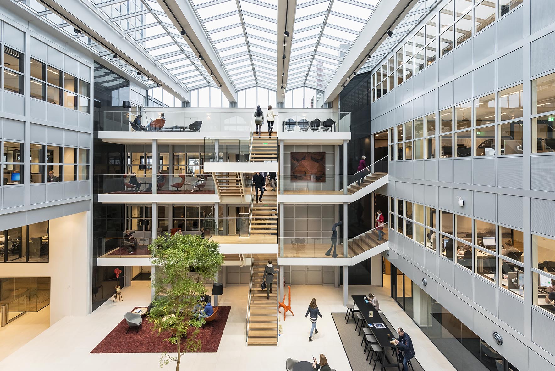 De twee gebouwdelen worden verbonden door een licht atrium, dat door een nieuw bar- en ontvangstmeubel tot uitnodigend ontmoetingsgebied transformeert. Met grote tapijten en een variatie aan meubilair zijn verschillende plekken gecreëerd. Nieuwe trappen en bordessen verbinden de verschillende vloeren rond het atrium.