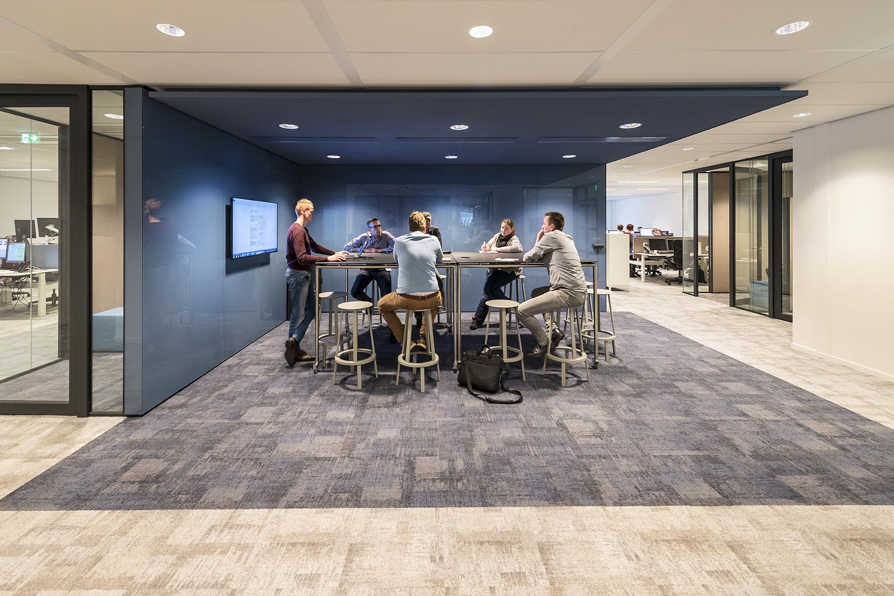 De werkplekken liggen rond clusters van vergaderruimten en concentratieplekken. Beschrijfbare wanden van backpainted glas en houten wanden met ingefreesde, Friese teksten scheiden verschillende ruimten. In het meubilair zijn zwarte tinten en eikenhout gecombineerd, die samen met de antracietkleurige kozijnen van de binnenwanden voor een intieme uitstraling zorgen.