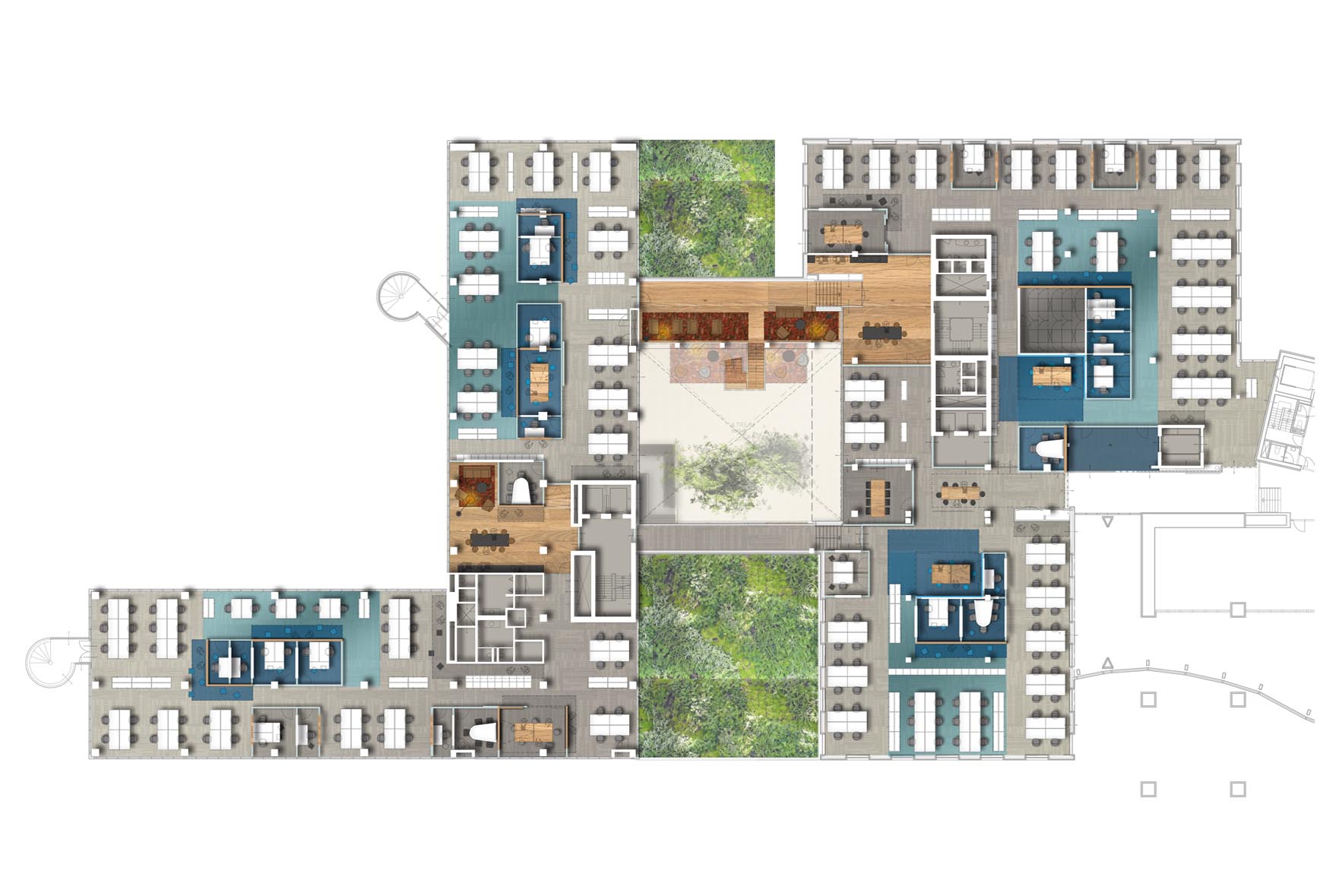 Door de kernwanden met eiken latten te bekleden ontstaat een natuurlijk tegenwicht van de aluminium gevels rond het atrium. Ook rond andere ontmoetingsgebieden creëren houten wanden en zachte tinten een warme omgeving. De werkgebieden onderscheiden zich hiervan, en worden gekenmerkt door een koelere blauwe kleurstelling.