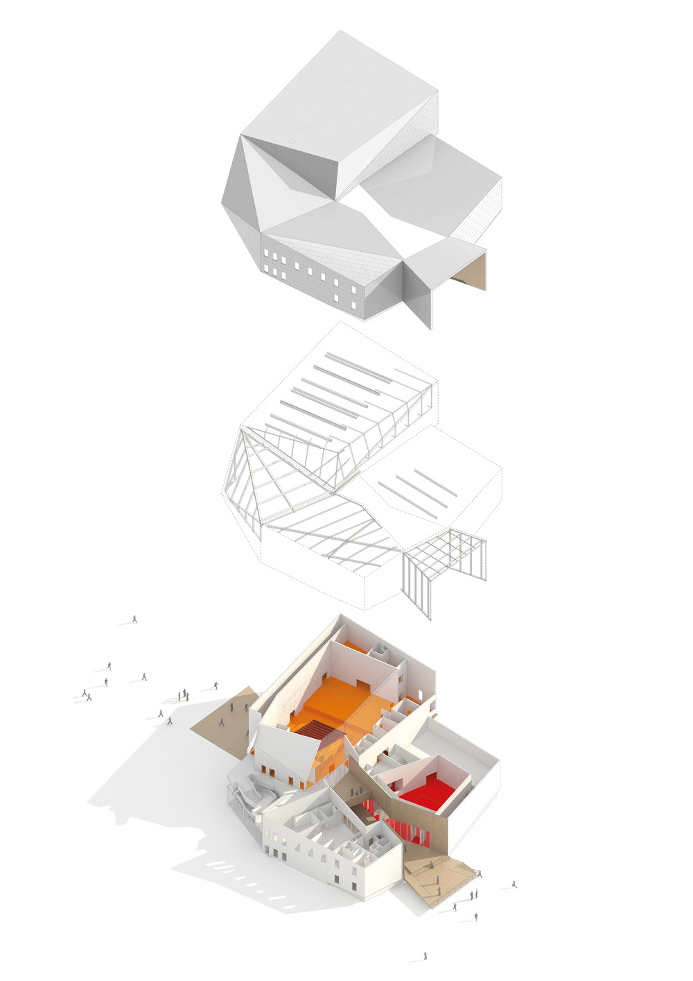 Vanwege de akoestiek zijn de concertzalen en opnamestudio’s als gescheiden betonnen dozen geconstrueerd. De hele structuur is bekleed met licht metalen panelen, waarvan sommige sterk reflecteren. Deze is als extra laag om de volumes getrokken en vormt hiermee een tweede akoestische barrière. Het houten dek steekt hier sterk tegen af, en lijkt daarmee onderdeel van het interieur.