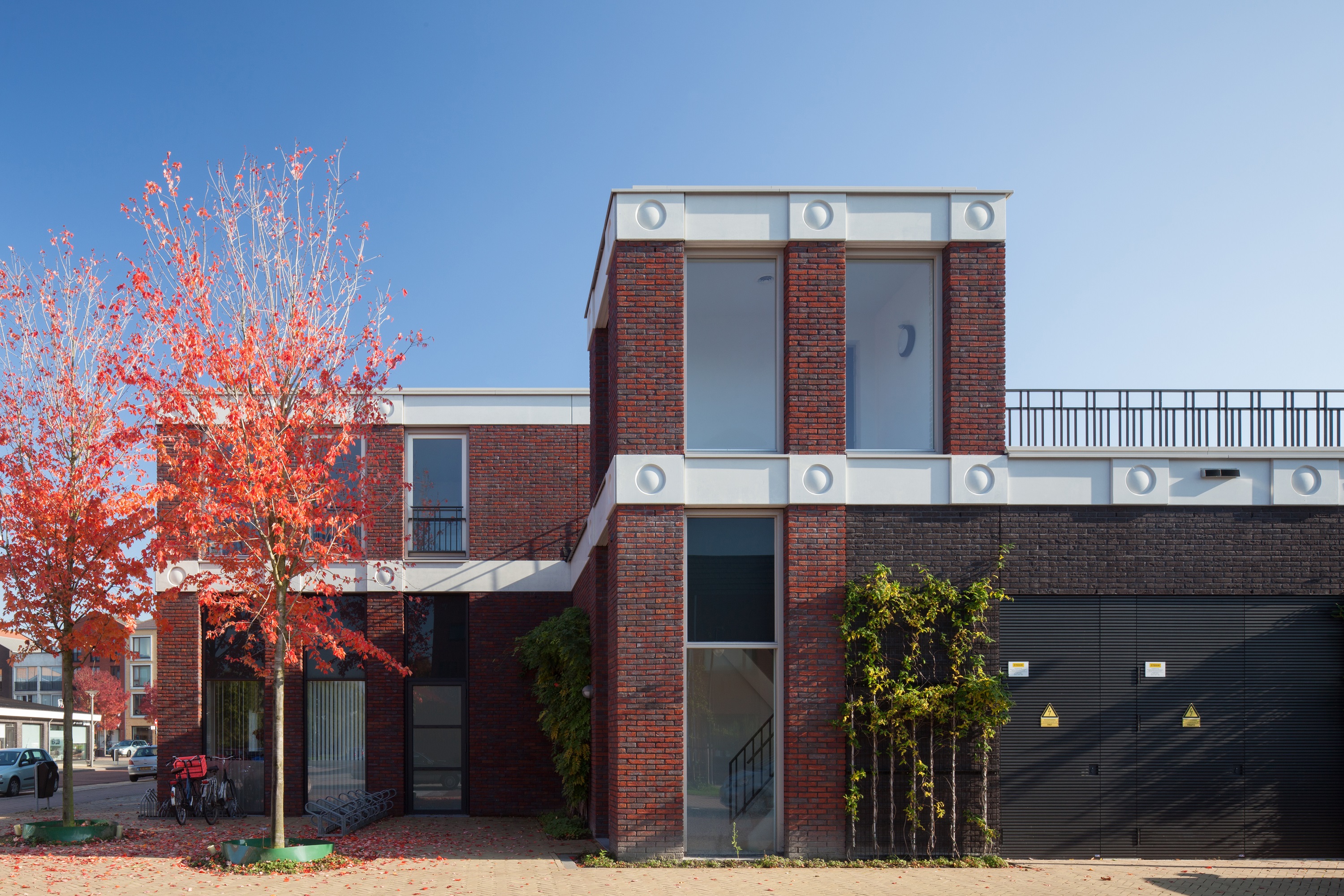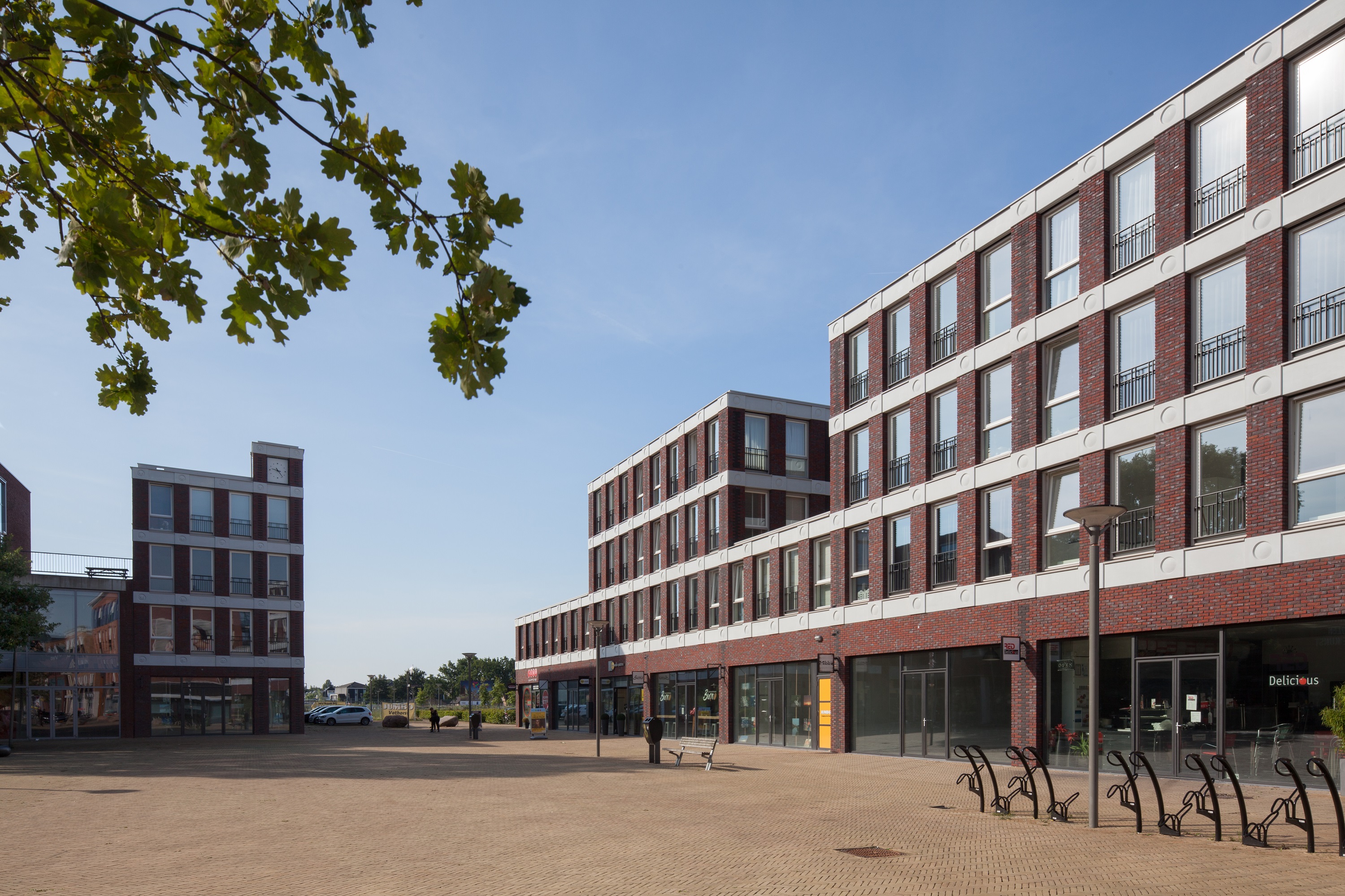 De ramen liggen achter diepe neggen waardoor het gevelraster sterk wordt benadrukt. Een deel van de openingen is uitgevoerd als Frans balkon. Deze hekwerken komen terug bij de galerijen en trappen aan de achterzijde. De appartementen in het grote blok hebben privéterrassen en een gedeelde buitenruimte op het dak van de supermarkt. Samen met de horeca en retail in de plint zorgen ze voor levendigheid in het centrum van Vathorst.