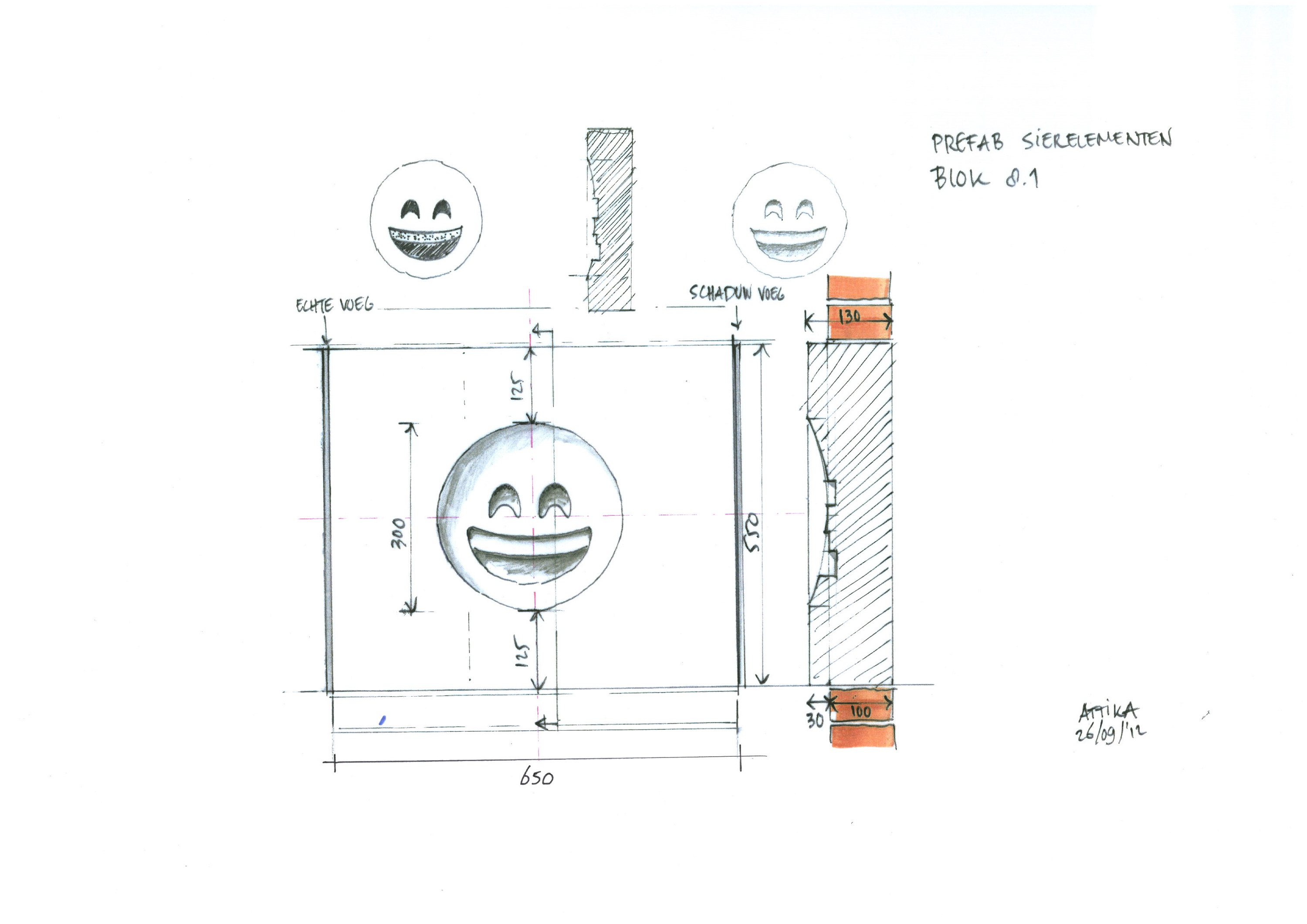 Na de eerste schets maakte Attika Architekten 3D modellen van de emoticons. In samenwerking met Millro zijn deze met een robotische freesmachine omgezet in MDF-mallen. De mallen zijn gecoat en vervolgens volgestort met beton, waardoor strakke, gladde ornamenten zijn ontstaan. Naast de emoticons is op de hoek van deze kopgevel een klok aangebracht, die de plek extra accentueert.