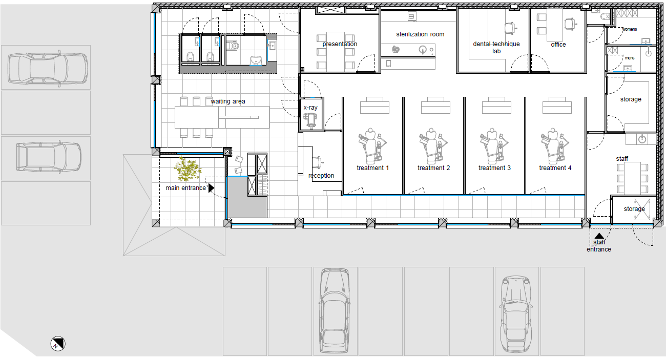 “Het ontwerp volgt een ‘box-in-box’ concept waarin een functionele ‘doos’ is geplaatst in het hoofdvolume. De doos is naar achteren geplaatst om een duidelijke scheiding tussen de personeelsfuncties en het publieke bezoekers gedeelte mogelijk te maken. Tegelijk ontstaat er aan de voorzijde van de behandelkamers een gang, die het gebouw ook een gelaagdheid van buitenaf geeft”, zo laat Dennis Villanueva weten.