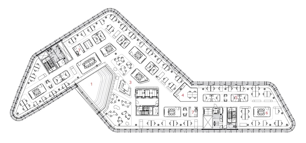 Op de derde tot de negende verdieping liggen werkplekken voor zevenhonderd werknemers. De verschillende afdelingen hebben elk een eigen domein waarbinnen het flexwerkprincipe geldt. In de relatief smalle vleugels liggen vrijwel alle werkplekken direct aan de gevel. In de zone daarnaast liggen zelfstandige werkplekken, vergaderruimten en zitjes. Vanwege de beukmaat en de transparante binnenwanden is het erg licht in het gebouw. De fijnmazige korrel van de gesloten ruimten deelt de plattegrond op in kleinere zones waarmee een prettig geschaalde werkomgeving ontstaat. Het interieur zit vol moderne technieken die de werkomgeving regelen. Zo zijn verlichting, temperatuur en zonwering via een app individueel te regelen en meten sensoren of vergaderkamers bezet zijn. Als het geluidsniveau van gesprekken te hoog wordt, produceert een ‘sound masking’ systeem een lichte ruis die zorgt voor minder afleiding tijdens het werk.