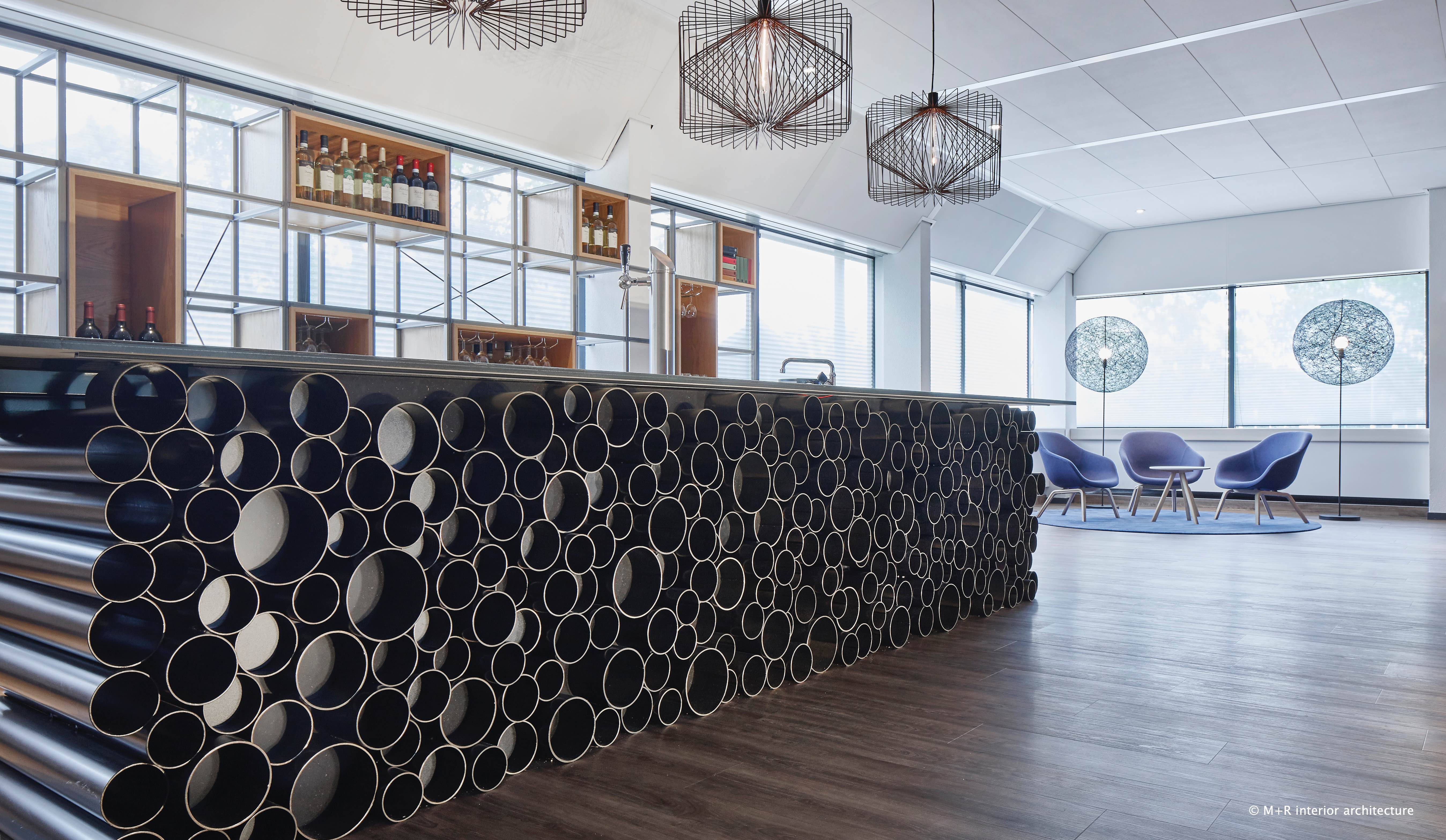 Dit is terug te zien in het behang van staalprofielen, een volledig stalen bar op stalen kokers, corten staal gebogen wand panelen, stalen buisprofielen barmeubel etc.