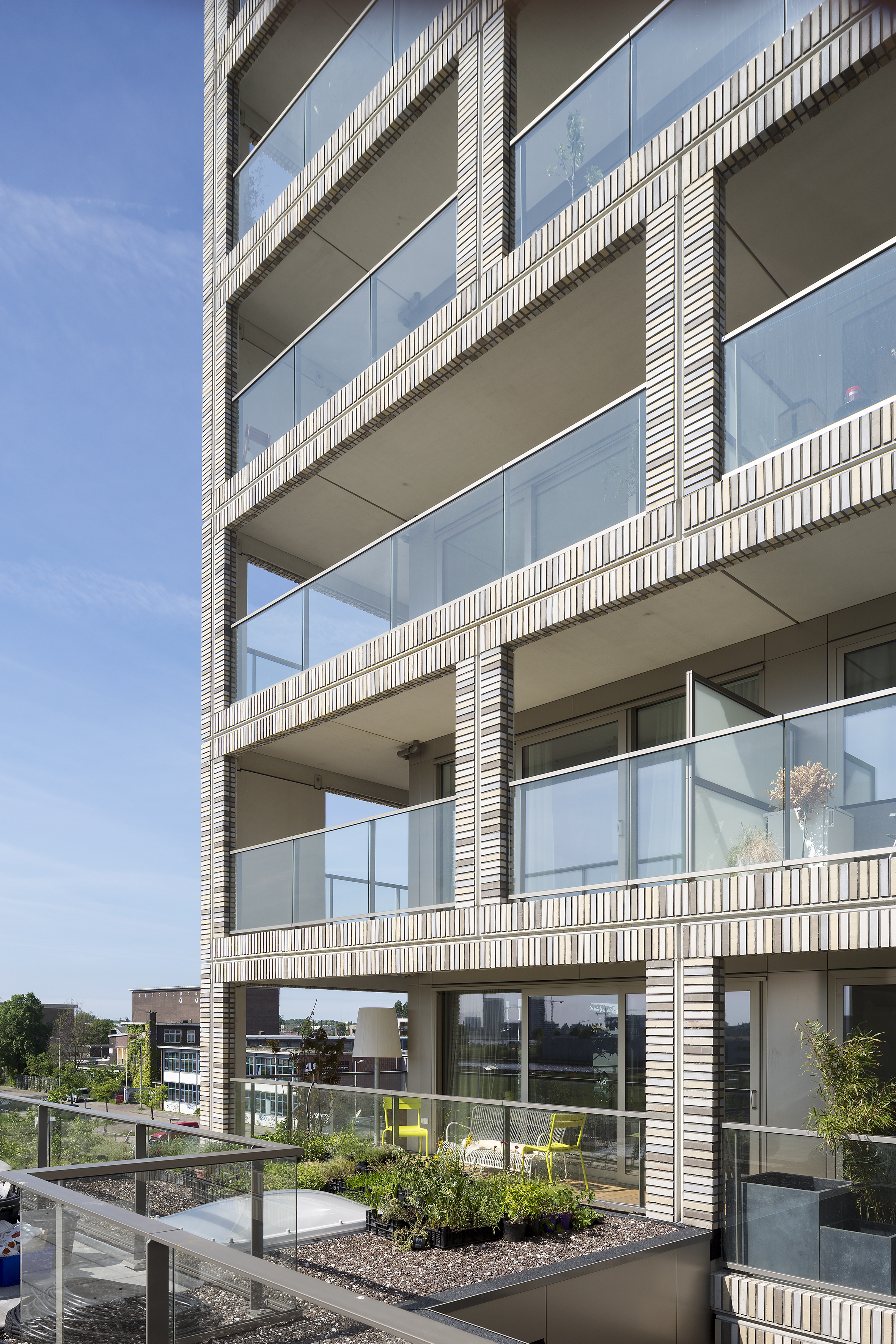 Het duurzame complex [EPC= 0,15] met geluidbelaste gevels en overhoekse, uitkragende balkons, bestaat uit 32 koopwoningen, 3 bedrijfsruimten met een tweelaagse parkeerkelder. Het gebouw staat op Kavel 21 die in crisistijd door de gemeente voor zelfbouw uitgegeven is. Grote buitenruimten en grote raampartijen kenmerken de appartementen die voorzien zijn van 2m diepe, riante balkons [20 tot 60m2], terrassen en grote verdiepingshoge aluminium schuifpuien. Ondanks de hoge duurzaamheidsprestatie heeft het gebouw een transparante uitstraling met grote raampartijen ten behoeve van de woonkwaliteit en overheerst de duurzaamheidstechniek niet het architectonische beeld. Er zijn duurzame, mooi verouderende materialen gebruikt zoals baksteen en geanodiseerd aluminium kozijnen.