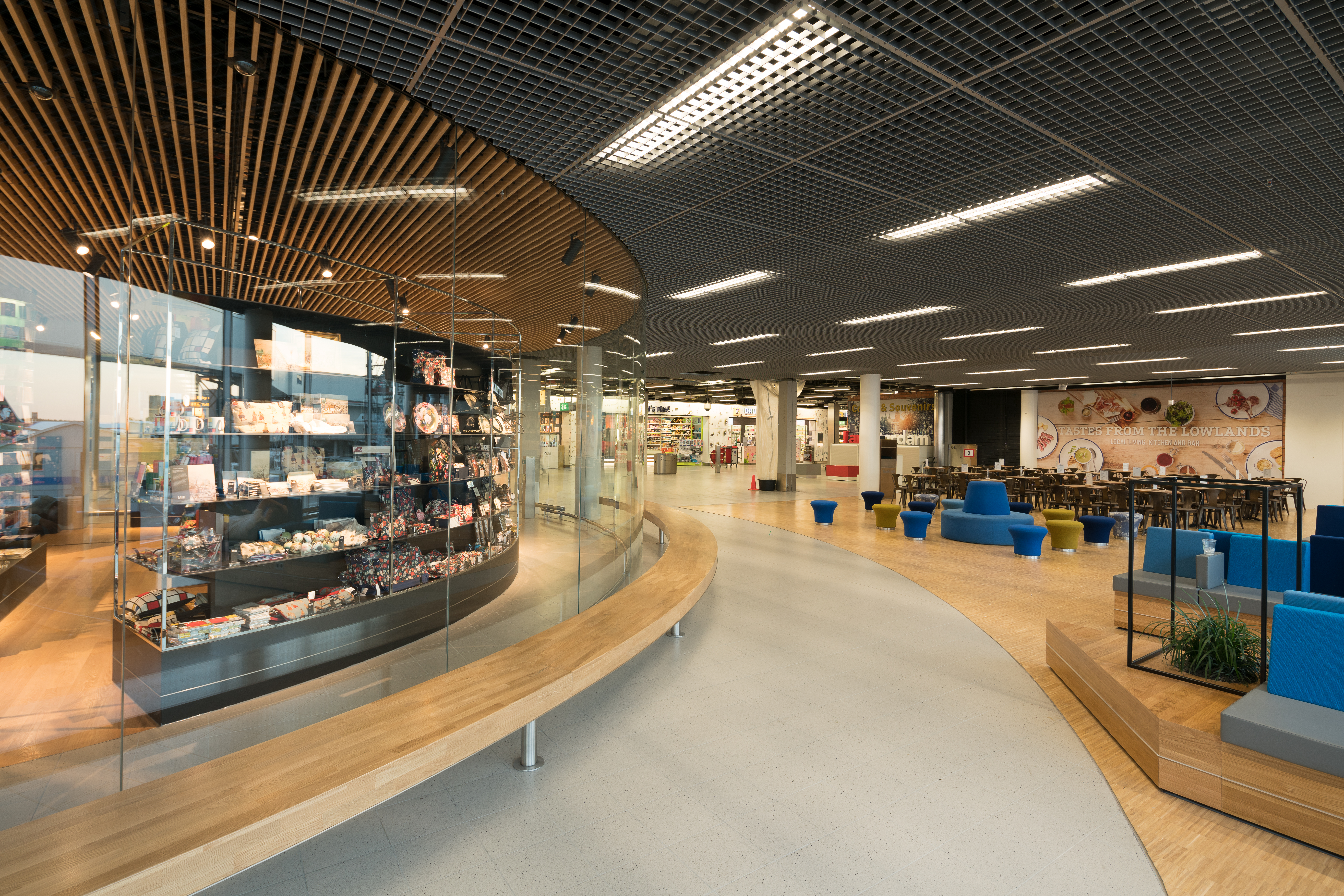 De museumwinkel voegt nog een derde U aan het ensemble toe. Deze is geheel transparant en een waardige aanvulling op het museum. De routing vanuit het museum sluit naadloos aan door de ronde wanden en dezelfde materialen voor vloer en wanden toe te passen.