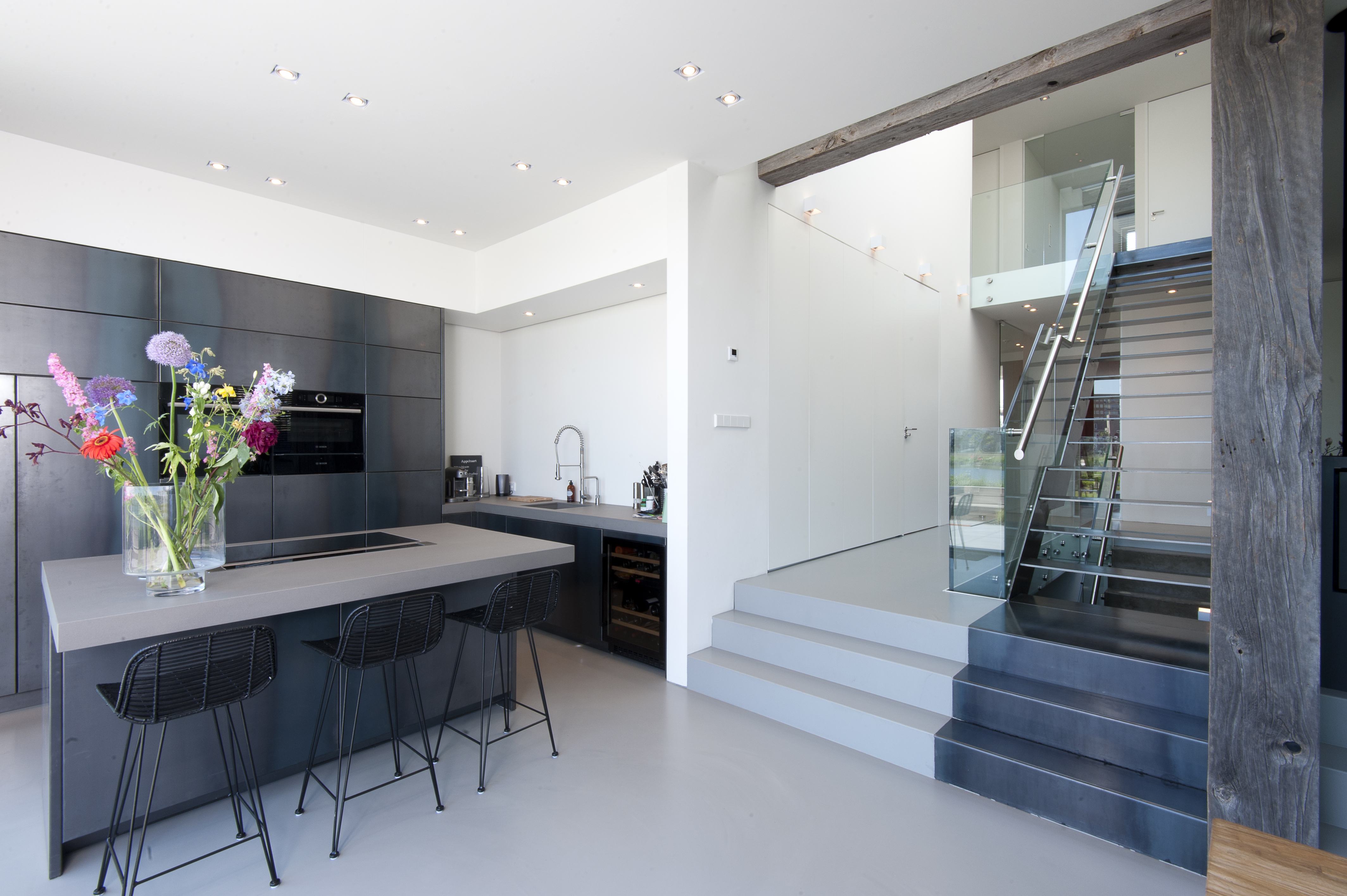 Aan achterzijde opent het huis zich naar het water toe en zijn een grote woonkeuken, eetruimte en 55 centimeter hoger gelegen zithoek gesitueerd. De grote pui beslaat de volle breedte van de woning en heeft een maat van 8 meter breed en 3.2 meter hoogte. De pui bestaat uit 3 met triple glass gevulde delen waarvan het middelste deel weggeschoven kan worden. Zo wordt het hart van het huis, met royale vide en trappenhuis, rechtstreeks via de tuin verbonden met de aanlegsteiger voor de boot.