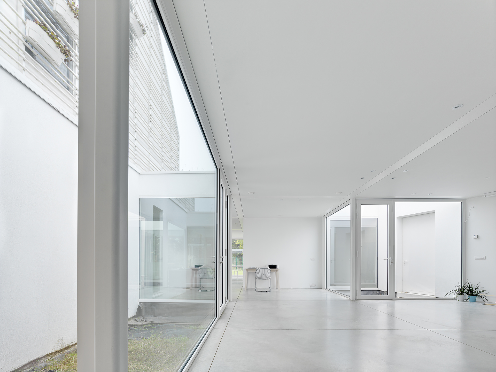 Drie patio’s, ingeplant op het raster, verlichten en zoneren de ruimte. Een intelligent constructieprincipe van stalen liggers steunend op onzichtbare kolommen vormen de dragers van opgehangen schuifpanelen die de ruimte kunnen opdelen en tegelijk expositiewanden vormen. Op het gelijkvloers bevinden zich de fotostudio, het bureau en de woonvertrekken die kunnen worden omgevormd tot expositieruimte. Op de verdiepingen, verholen achter het raster van buisprofielen waaraan kleurrijke bloembakken kunnen worden gehangen, bevinden zich de privévertrekken.