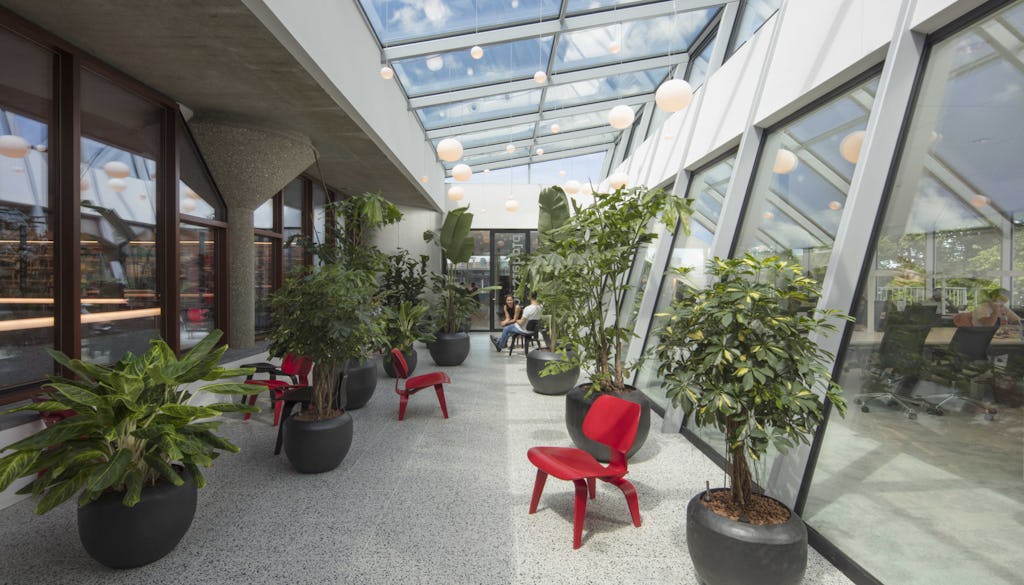 Vandaag de dag is de bibliotheek meer dan ooit een plek van ontmoeten, van elkaar maar ook in relatie tot kennis. Je komt mensen en boeken tegen die je thuis of in het digitale niet zomaar tegen komt. De bibliotheek wordt een andersoortige huiskamer. De kwaliteiten en comfort van het in je eigen woonkamer zijn kan een belangrijke toevoeging aan de bibliotheek zijn. Dit idee wordt door serre in de Asian Library bekroond. Het is een plek waar je tussen de planten een moment van reflectie vindt. 3: werken tussen boeken. De studie werkplekken staan haaks op de lange rijen boekenkasten. De collectie stelt zich in de achtergrond voor, zoals in de klassieke bibliotheek, met op de voorgrond het opzoeken, werken en studeren. Er zijn werkplekken in de kasten, om te werken te midden van kennis. Hierdoor ontstaan tevens openingen in de kasten voor doorzicht en uitwisseling tussen de verschillende afdelingen en de studieplekken, waardoor de browsende bezoeker wellicht iets onverwachts ontdekt en dit ter plekke kan bekijken en onderzoeken, zo biedt de bibliotheek meer dan het digitale doet.