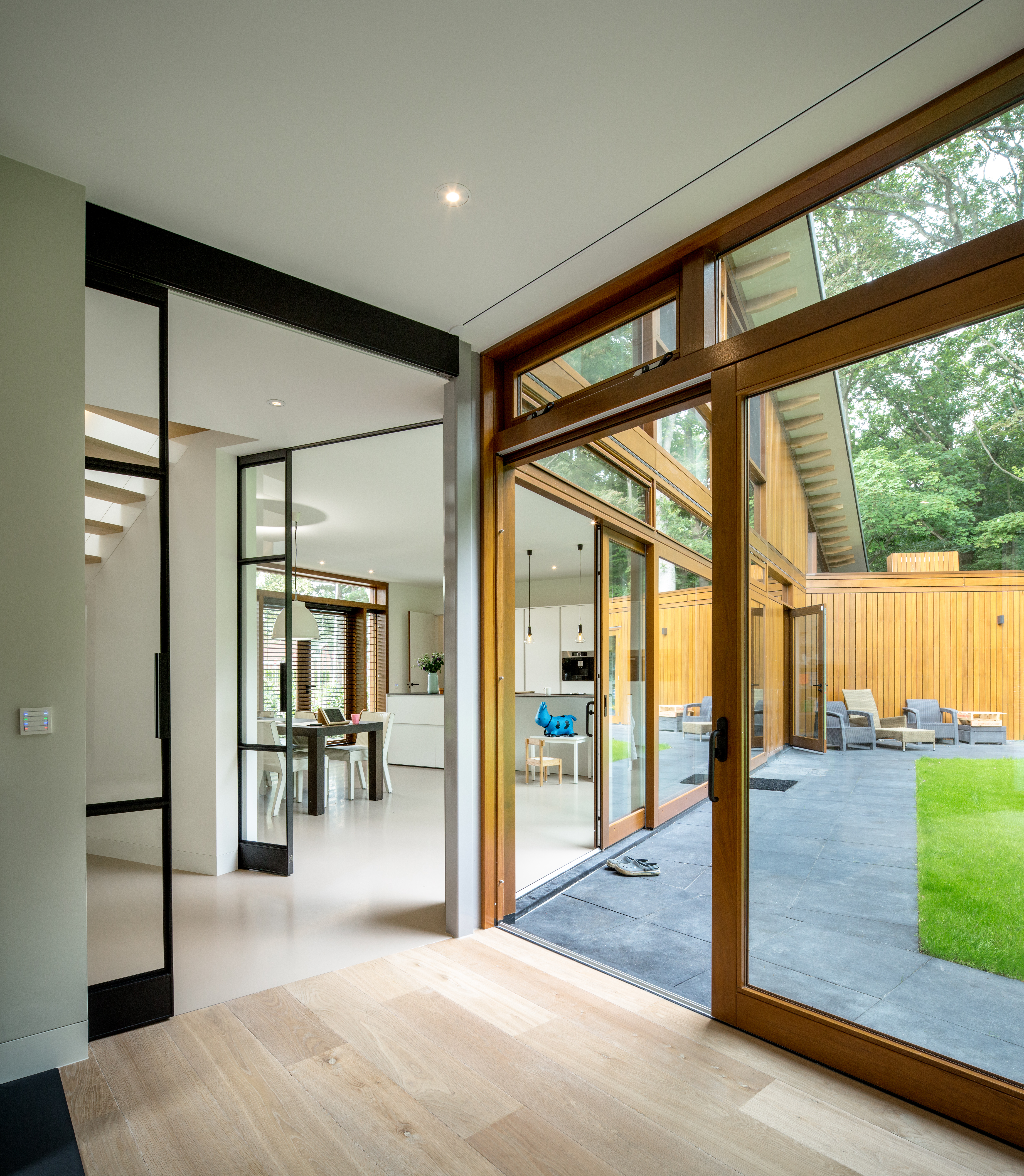 De villa en het landschap zijn met elkaar vervlochten. Vanuit de woonvleugel is door de grote pui en via de buitenruimte de werkvleugel zichtbaar. Dit maakt de bosrijke omgeving sterk voelbaar vanuit elke ruimte. Door aan de achterzijde van de villa grote schuifdeuren te openen wordt het landschap de verbinding tussen de woonkeuken en woonkamer. Het vormt een landschapskamer en wordt een integraal onderdeel van het woonhuis. Dit principe schept een zeer ruimtelijke en rijke beleving.