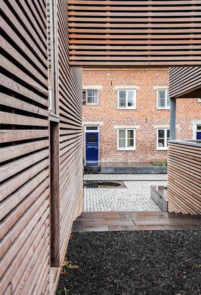 De nieuwe binnenplaats komt centraal te staan. Het hoogteverschil wordt gebruikt om zitranden te ontwerpen en terrassen te maken. Afvoer van het regenwater wordt geleid via een zichtbaar in het werk gestort watersysteem. Gekletter van het water, inheemse planten, dat in alle seizoenen hun schoonheid tonen prikkelen alle zintuigen. De eigenheden van de plek zijn op alle niveaus ingezet om de authenticiteit het bestaande te versterken naar een nieuwe toekomst.