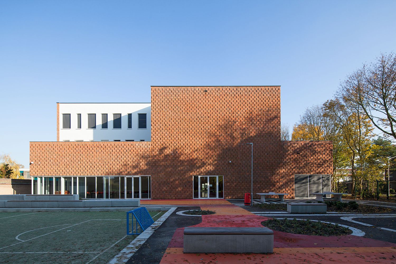 De gevels zijn uitgevoerd in verticaal gemetselde rode baksteen. Een ritme van stenen die uit het vlak springen, zorgen voor een gevelpatroon dat het gebouw een duidelijk eigen identiteit geeft. Diverse uitsneden zorgen voor daglichttoetreding en creëren ruimte voor dakterrassen en -tuinen. De hieraan gelegen lokalen profiteren van volop daglicht, terwijl het verticale ritme van ramen, lamellen en panelen prikkels van buitenaf vermindert.