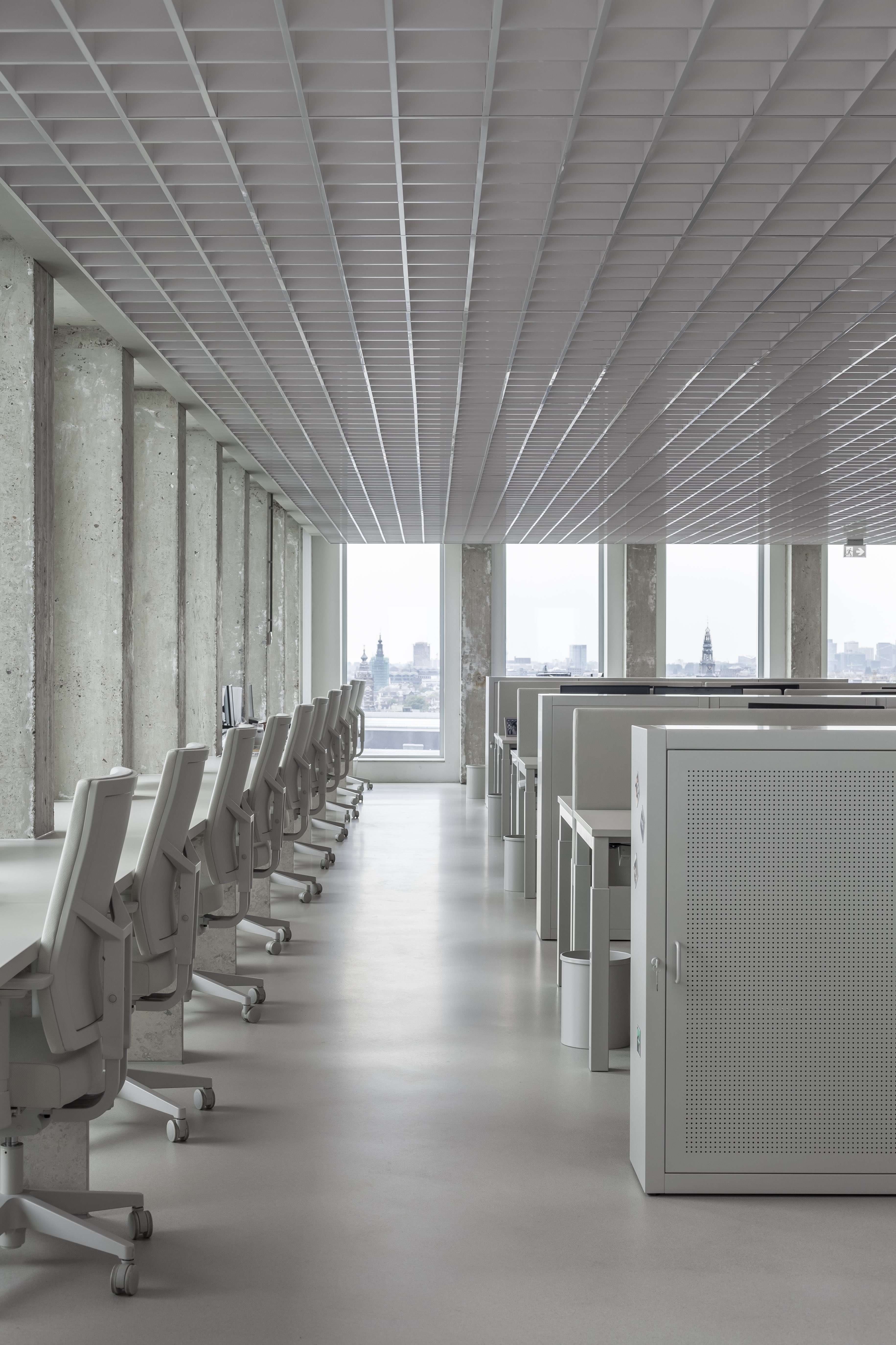 In de kern bevinden zich de dienende gebruiksfuncties zoals de toiletten, liften en trappen, daarbuiten is de hele ruimte ontdaan van obstructies. Daardoor is er vanuit het hele kantoor een prachtig vrij uitzicht over Amsterdam en de omgeving. De betonconstructie van de gevel is bewust in het zicht gelaten en vormt een belangrijk onderdeel van het interieur.