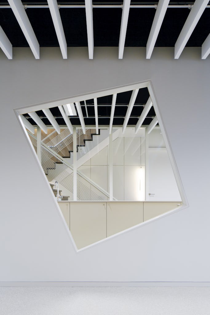 Door de langwerpige vorm kan men bovendien verder uit elkaar zitten, waardoor er minder onderlinge geluidsoverlast is. Op de begane grond zijn alle wanden 90 graden geroteerd, waardoor een prettige entreeruimte ontstaat over de gehele breedte van het gebouw. Strategisch geplaatste openingen in de wanden verbinden de afzonderlijke segmenten, en zorgen voor een coulissen effect. Daarnaast is de beleving van de ruimte afhankelijk van de richting waarin de gebruiker zich beweegt; aan de ene kant zijn de muren grijs, aan de andere kant bekleedt met berkenmultiplex.