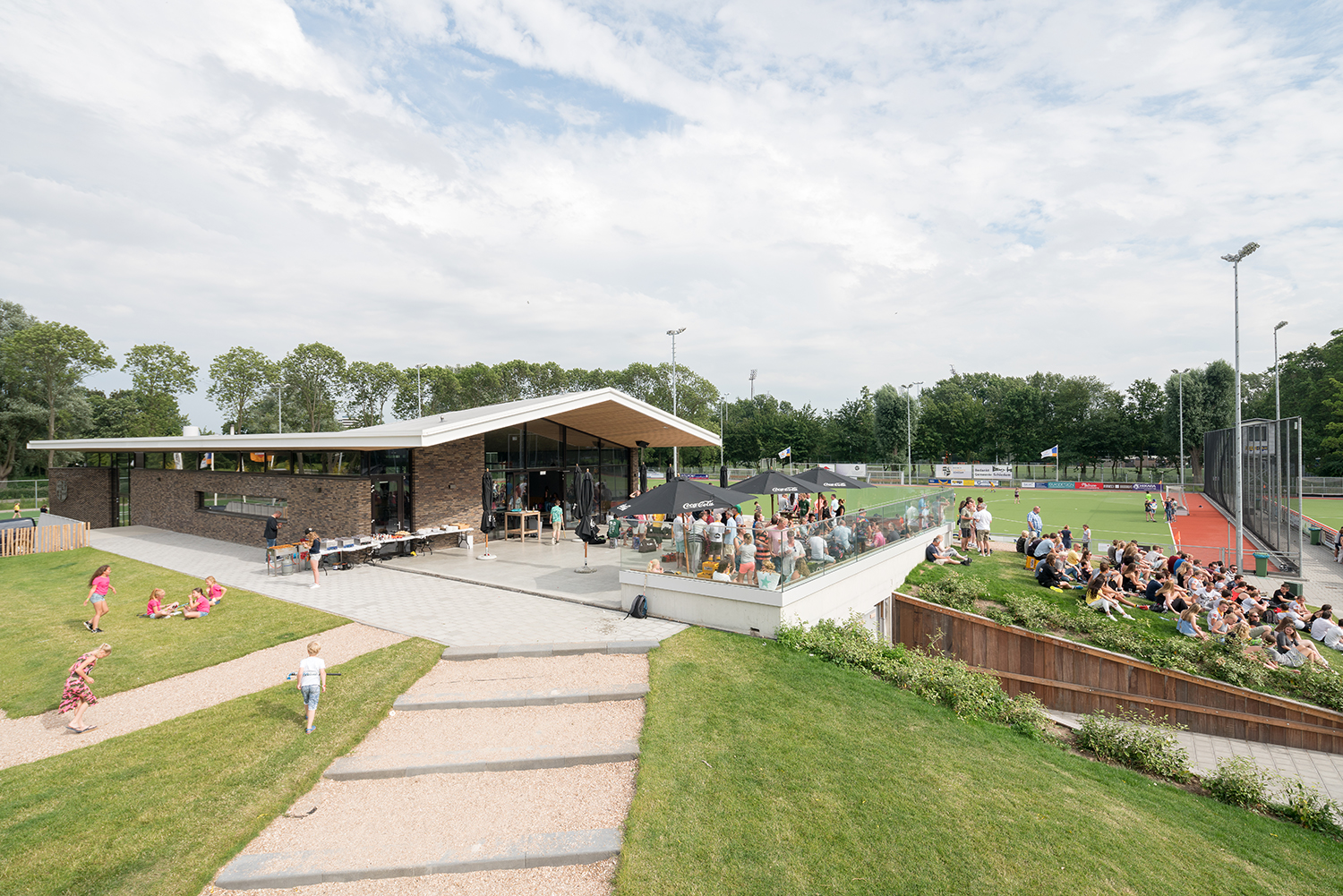 Het gebouw functioneert als een paviljoen met een alzijdige oriëntatie in het hart van het complex, ingebed in een groen landschap met flinke terrassen, een tribune en taluds, waar verschillende niveaus moeiteloos in elkaar overgaan. De dakvorm is cruciaal in de soepele verbinding tussen binnen en buiten. Onder het uitkragende dak richting de terrassen en velden zijn er veranda-achtige tussenruimtes die in alle weersomstandigheden gebruikskwaliteit toevoegen. Een opgaande lijn in het dak en een subtiele hoekverdraaiing in de gevel - voorzien van een metselwerkreliëf - markeren de entree, die halfweg de twee etages is gesitueerd. De uitkragende daken richting terras, entree en tribune geven het gebouw, ondanks een relatief bescheiden omvang, een grote ruimtelijke impact op de omgeving.