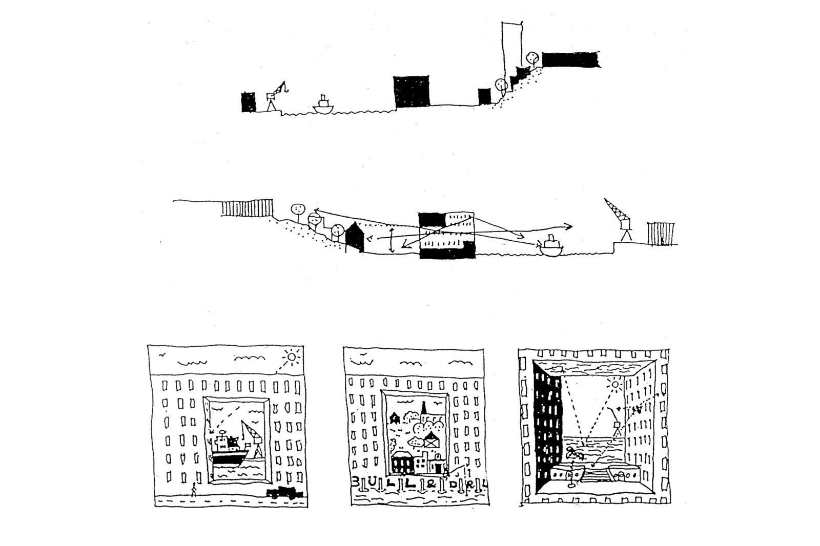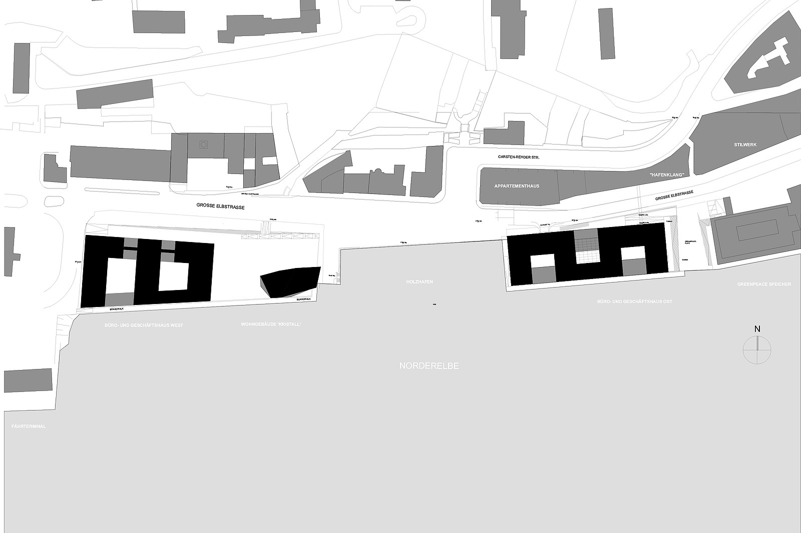 De kantoorgebouwen Oost en West zijn monumentale, diepe gebouwen met binnenhoven en openingen die het contact tussen de Elbe en het achterland waarborgen. Tussen beide gebouwen zal de woontoren ‘Kristall’ zich als een geslepen stuk kristal boven zijn omgeving verheffen.