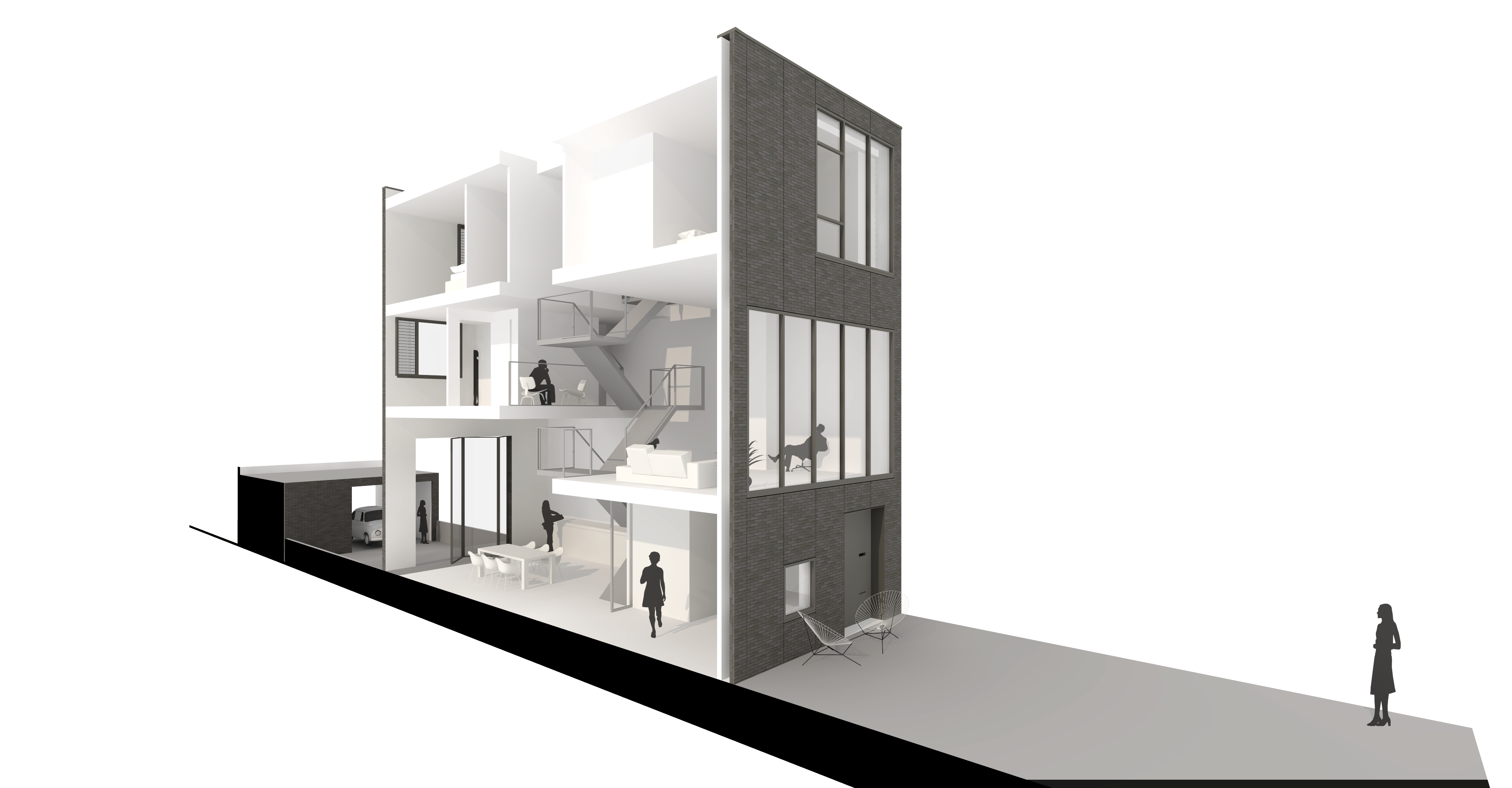 Deze riante verdiepingshoogte karakteriseert zowel de woonkeuken op de begane grond als de woonkamer op de eerste verdieping. Centraal in het huis hangt een open, stalen trap die de verschillende levels fysiek en visueel verbindt. Hieraan ligt ook het ‘binnenbalkon’ dat de kinderslaapkamers ontsluit en eveneens uitkijkt over het IJ. De hoogste etage met twee slaapkamers en de badkamer die voorzien is van een daklicht is meer besloten.